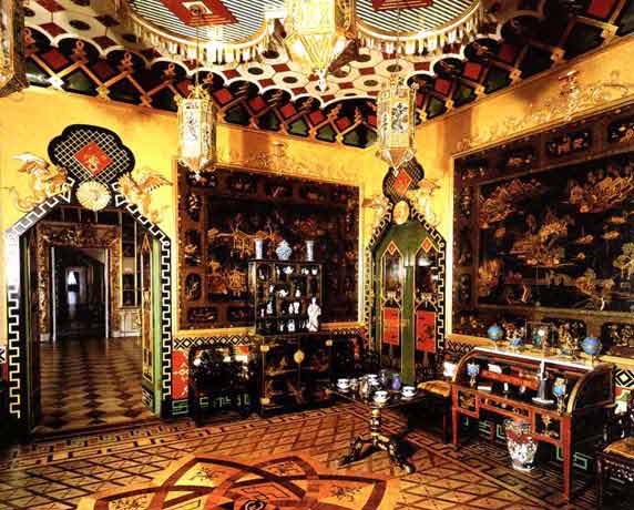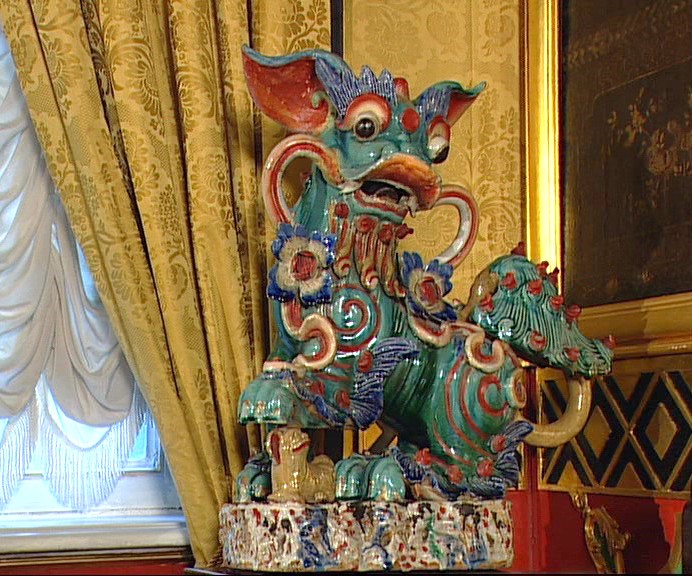 Западный китайский кабинет можно сравнить с золотой шкатулкой для заморских диковин и редкостей. Здесь хранили одно из ценнейших сокровищ дворца — собрание фарфора. Хитроумные китайские мастера ревностно оберегали тайну изготовления фарфора, а потому в Европе он ценился на вес золота. Посудой из китайского фарфора почти не пользовались, зато с удовольствием выставляли на всеобщее обозрение. Если же какой-то из фарфоровых предметов разбивался, его черепки, словно драгоценные камни, оправляли в золото и носили на груди.