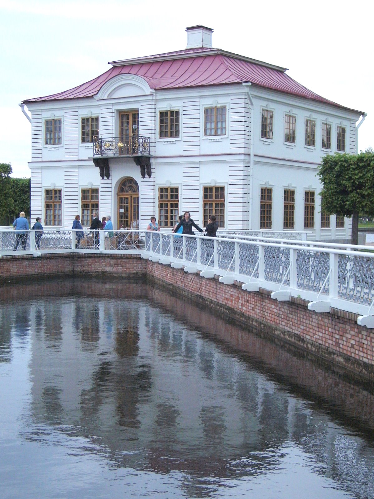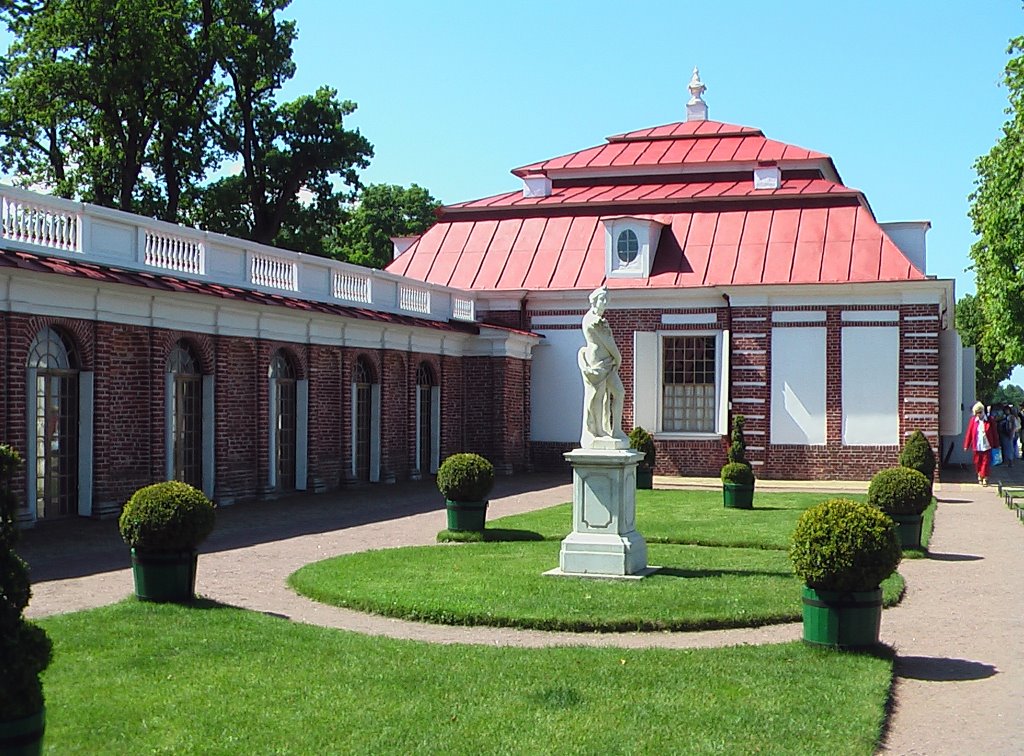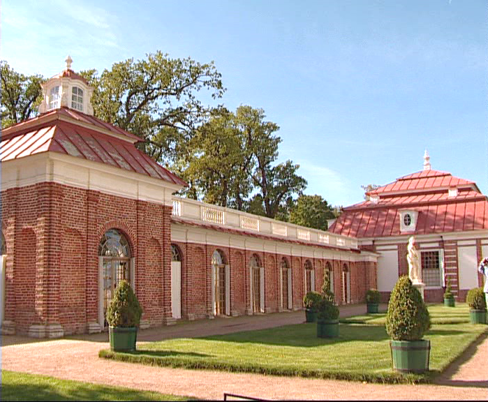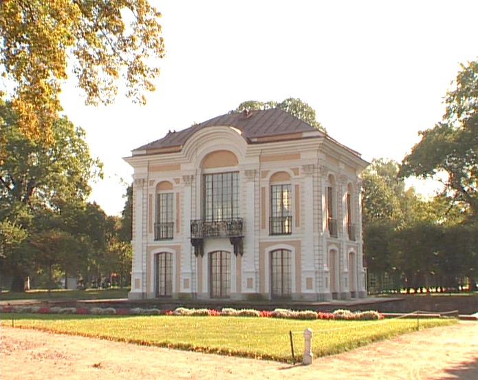 Павильон "Эрмитаж", как и "Марли" создал архитектор Браунштейн, а потому не удивителен ряд общих черт, объединяющих эти сооружения. Та же высокая на голландский манер кровля, стены, украшенные рустом, балконы с ажурной решеткой. Балконы и решетки в точности повторяют те, которые были сделаны на корабле "Ингерманландия", с которого в 1716 г. командовал объединенными флотами России, Англии, Голландии и Дании император Петр I.Необыкновенно изящный и стройный павильон издали кажется изысканной игрушкой, бережно поставленной на массивное каменное основание, словно на выставочную витрину или напоминает сказочный замок, окруженный рвом.