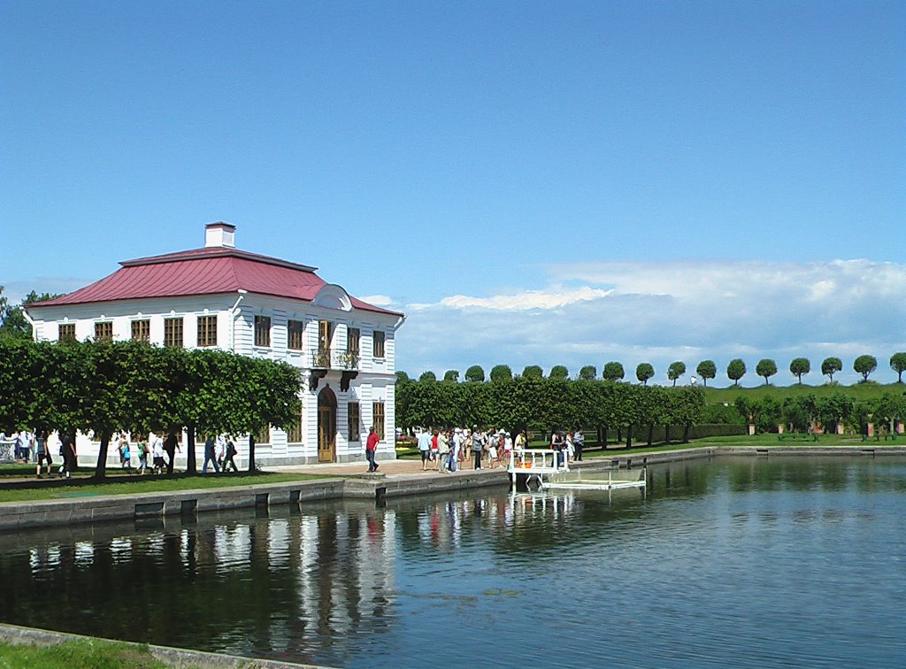 На высокой террасе в восточной части Нижнего парка расположился любимый дворец Петра I — Монплезир, что значит "моё удовольствие". Хотя раньше дворец именовался "Голландским домиком" за схожесть планировки и отделки с "бюргерскими" жилищами в Голландии.
