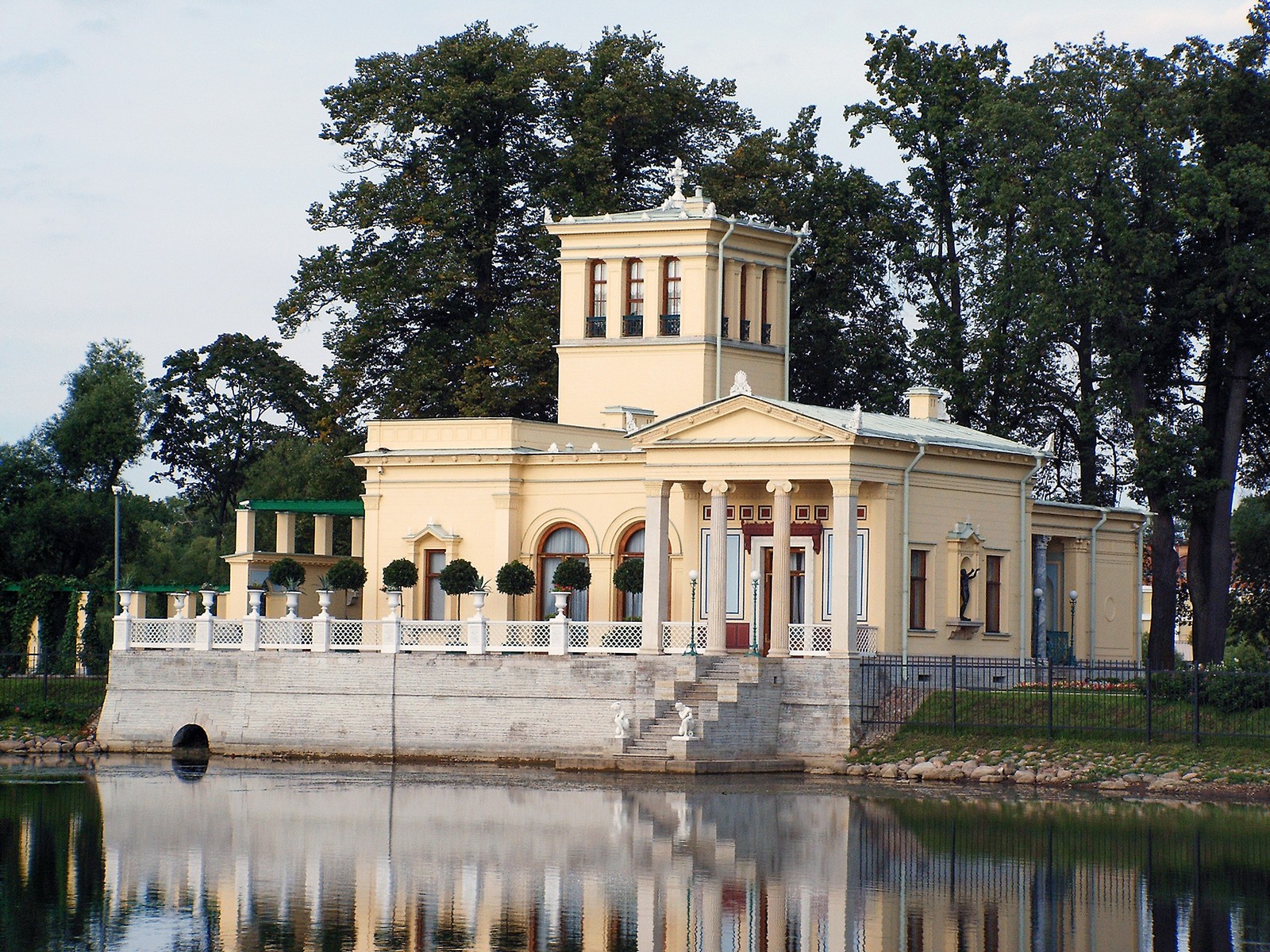 Главный фасад павильона обращен к пруду и украшен живописной ажурной террасой, на которую летом выставляют экзотические растения и цветы. От античного ионического портика устроен спуск к воде. Сюда прибывали лодки и гондолы для желающих прокатиться по воде. Соединение острова с сушей происходило с помощью парома, вмещавшего до 20 человек.