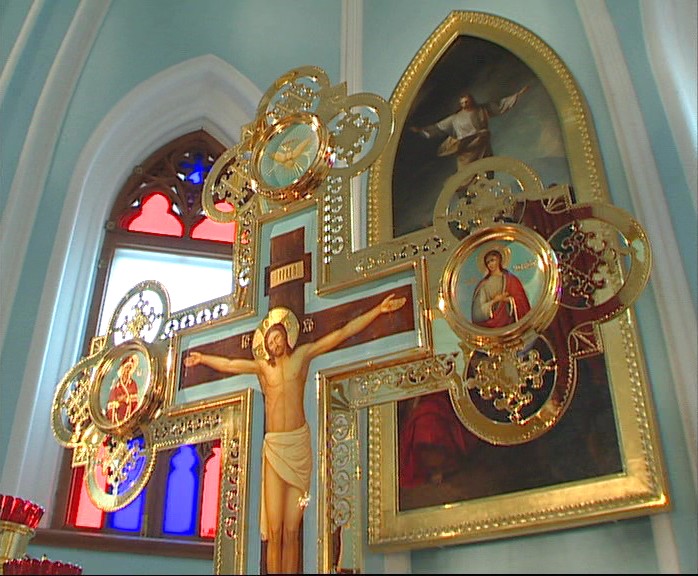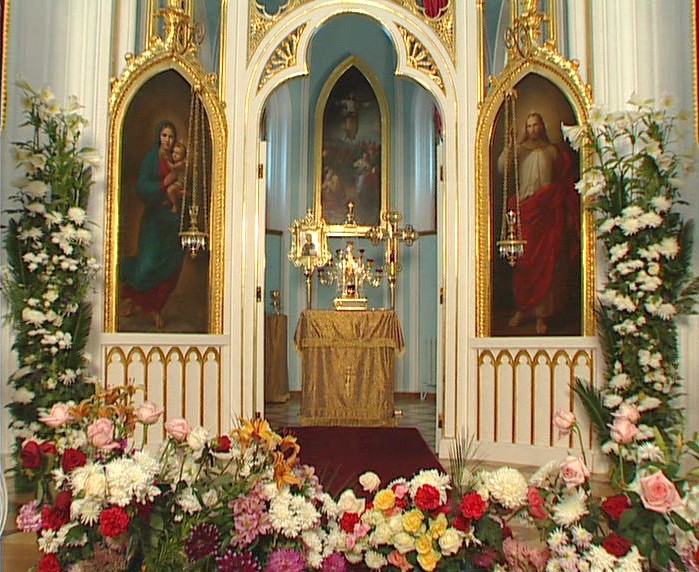 Внутри храма все выполнено согласно православным церковным канонам, но декоративная, не имеющая религиозного характера, отделка храма по прежнему сохраняет черты неоготики. Алтарь отделен от церковного зала золоченым иконостасом. На створках царских врат изображено благовещение и 4 евангелиста. Живопись иконостаса и запрестольный образ воскресения Господня выполнены художником Неффо.