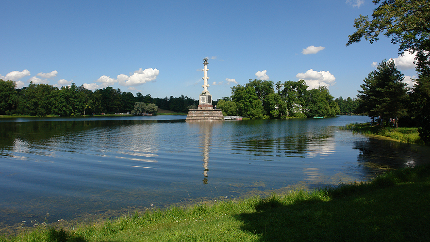Большой пруд у павильона «Грот» – это искусственный водоем, глубиной 2,5 метра. При Екатерине II на островке играл оркестр, а посетители парка катались на лодках и слушали музыку. Прямо из воды возвышается Чесменская колонна, сооруженная по проекту архитектора Ринальди, установленная здесь в 1774 году в честь побед в русско-турецкой войне.