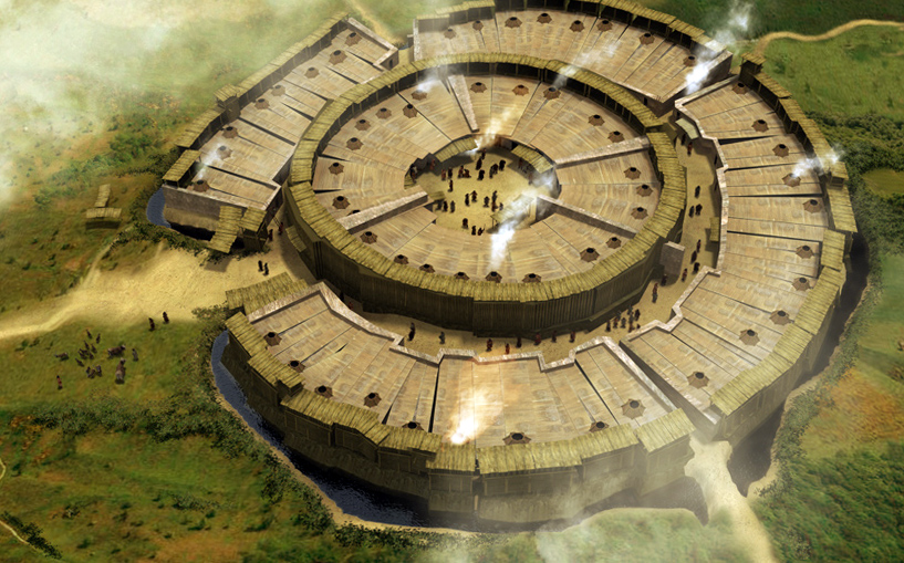 Все улицы в этом городе внутри были исполнены также в форме колец, сообщающихся друг с другом. Как показали раскопки, люди на центральной улице ходили по настилу из бревен. Настил в свою очередь был уложен на систему канавок в земле, которая позволяла во время сильных дождей отводить излишки воды прямо в ров у внешней стены. Прямо к внутренней стороне внешней стены города примыкали достаточно большие дома, в которых, вероятно, жили древние люди города. Ученые насчитали таких жилищ на главной улице больше тридцати.