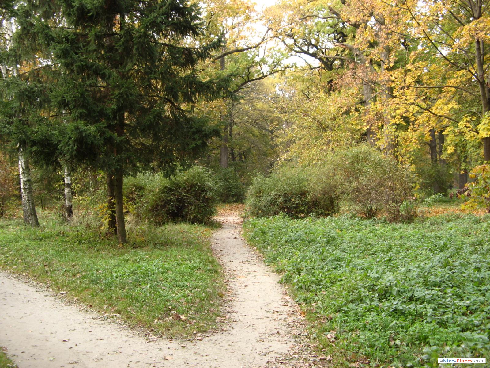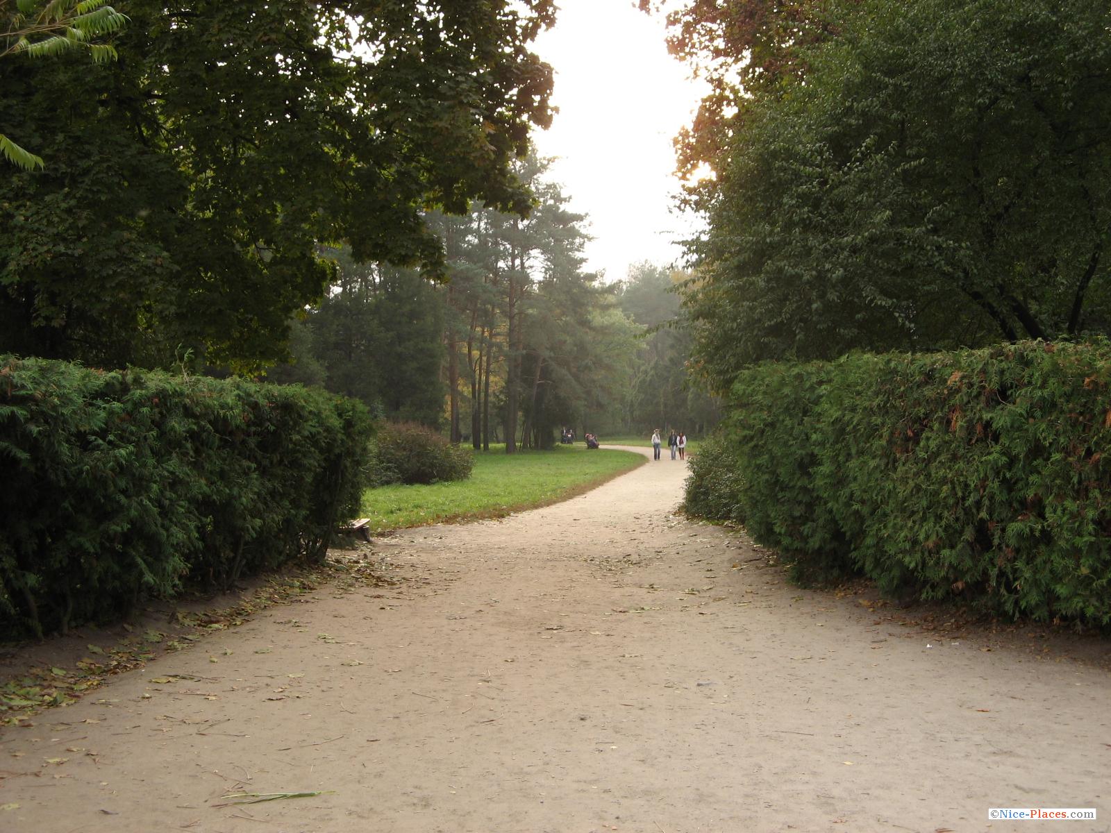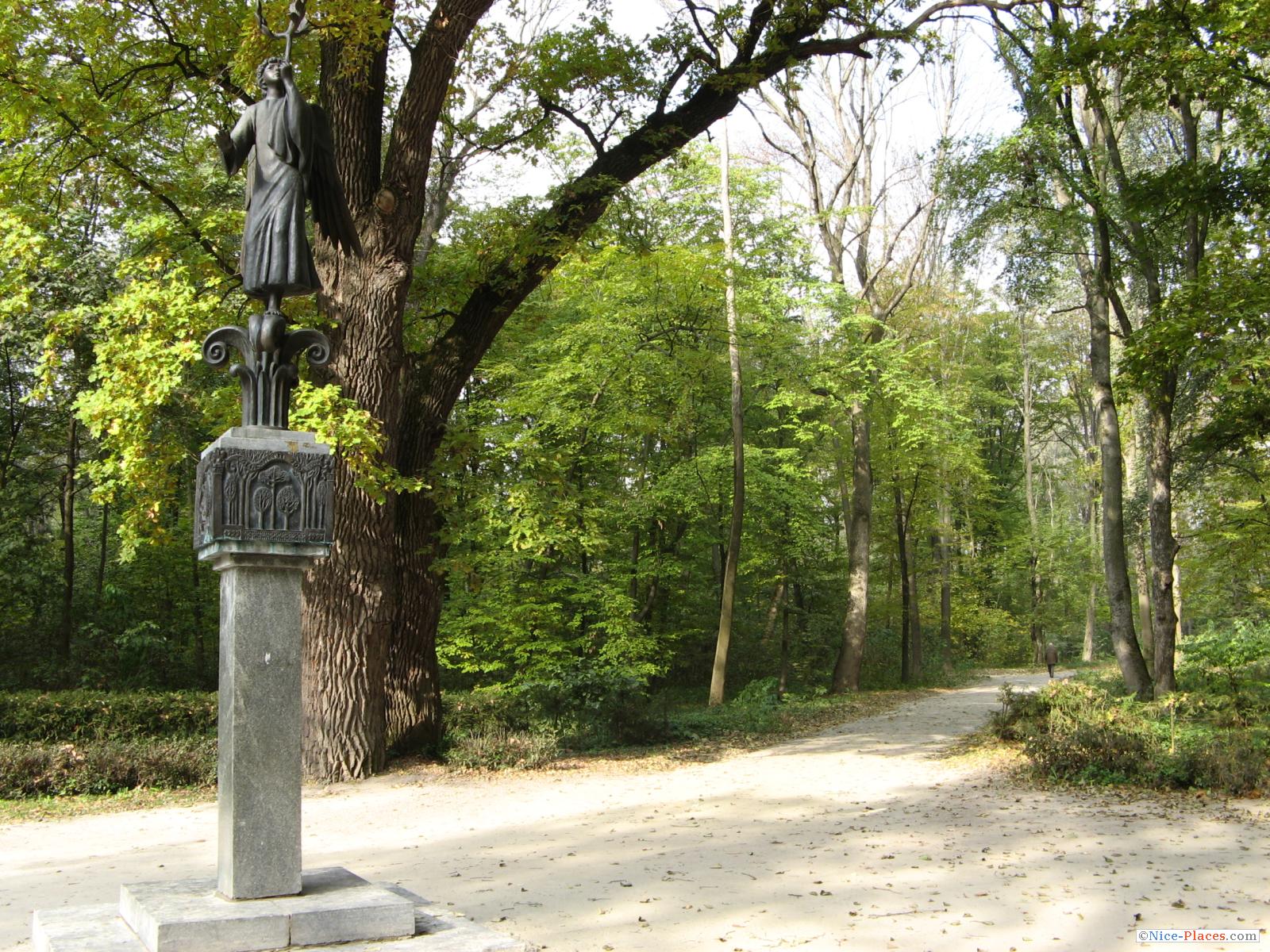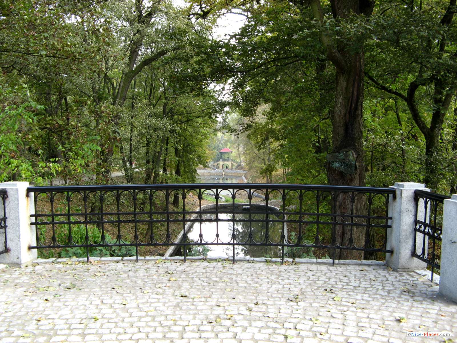 По всему парку — аллеи, аллейки, тропки. На аллеях часто попадаются лавочки, и возле каждой обязательно — небольшая, размером с ведро, урна, причём она наполовину вкопана в землю, то есть она не особо-то и портит вид. :-) Хватает и статуй, но они не массивные "железобетонные", а изящные, литые, из бронзы или чего-то наподобие. Есть и постройки: ротонда, несколько альтанок, колонны... А еще есть колоннада, это колонны в два ряда, накрытые крышей, выстроенные почти полукругом, и в причём в одном ряду колонны соединены стеной. Там удивительная акустика: в некоторых местах звук глушится, а в некоторых местах есть эхо. А еще можно стать в одном конце колоннады и негромко что-то сказать, а в другом конце колоннады будет всё очень хорошо слышно — удивительно.