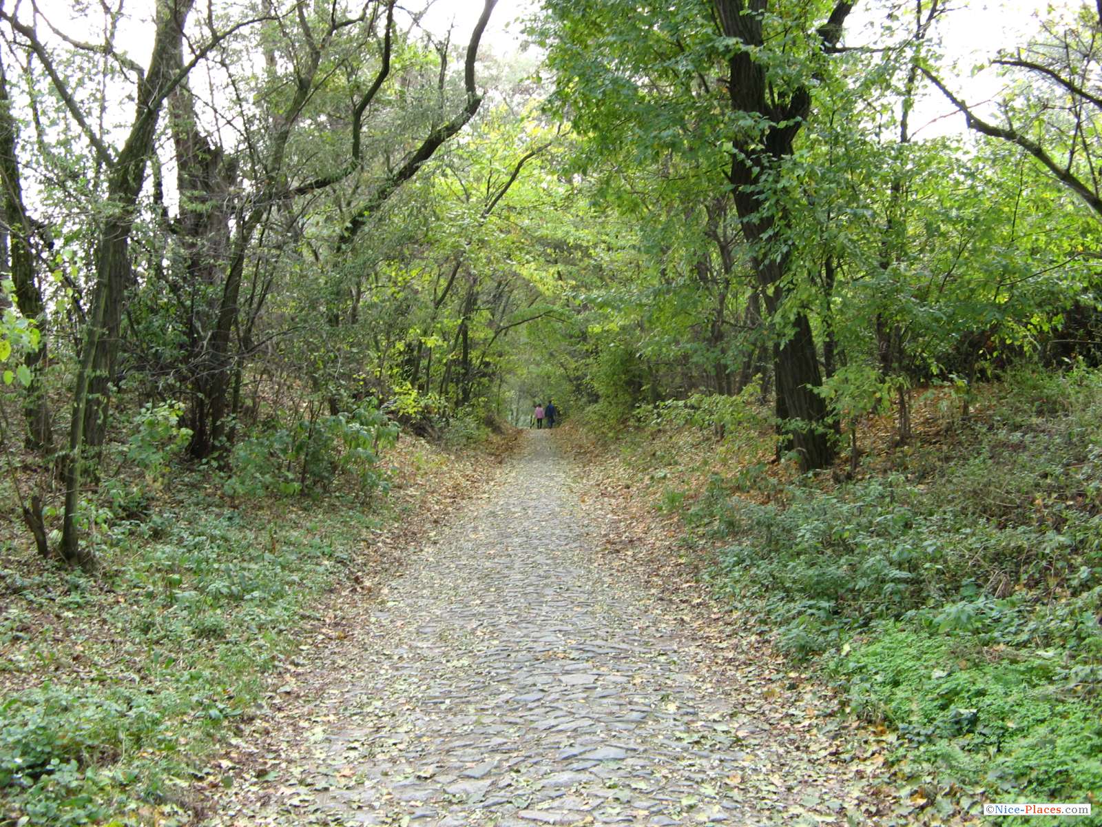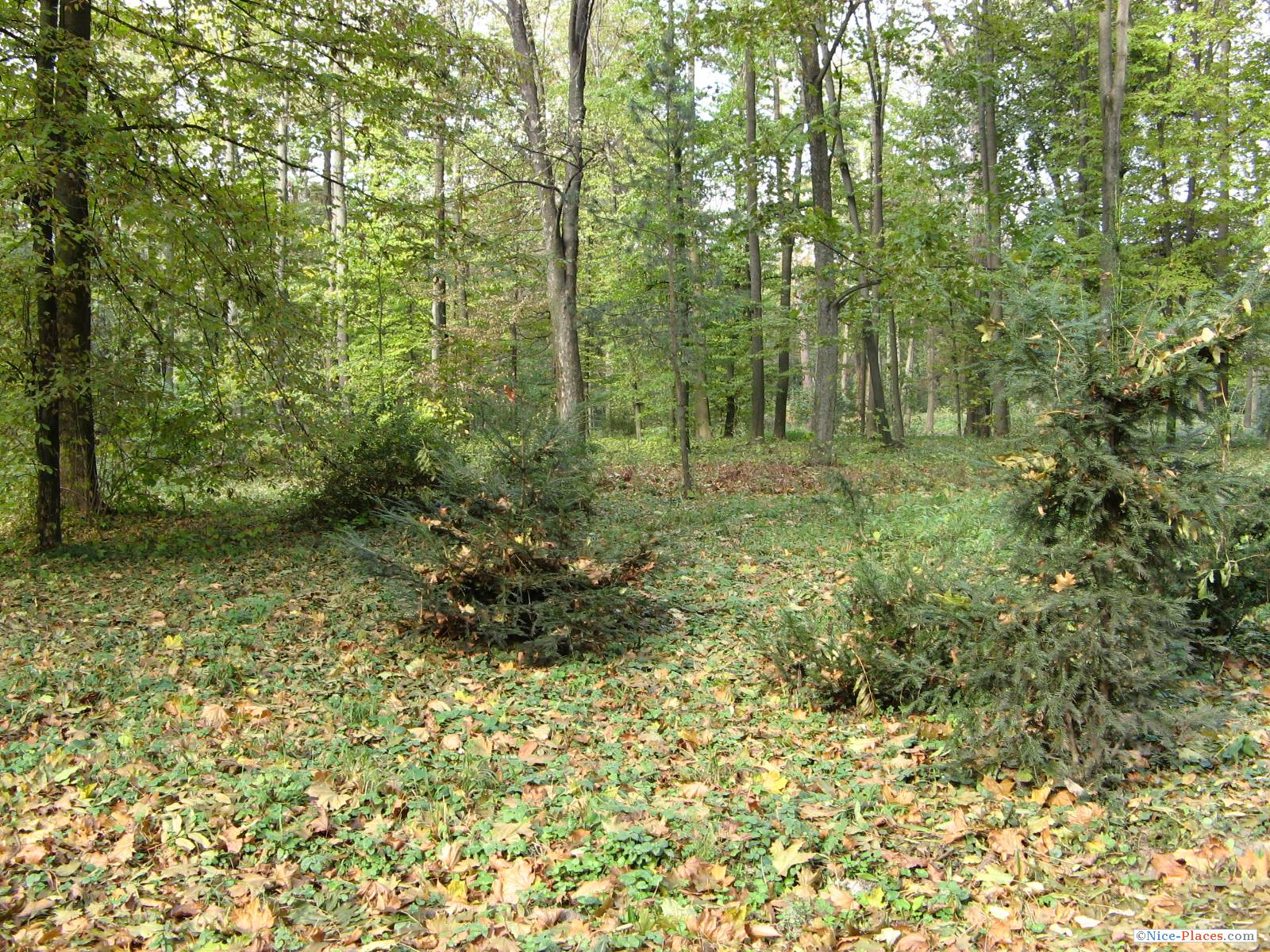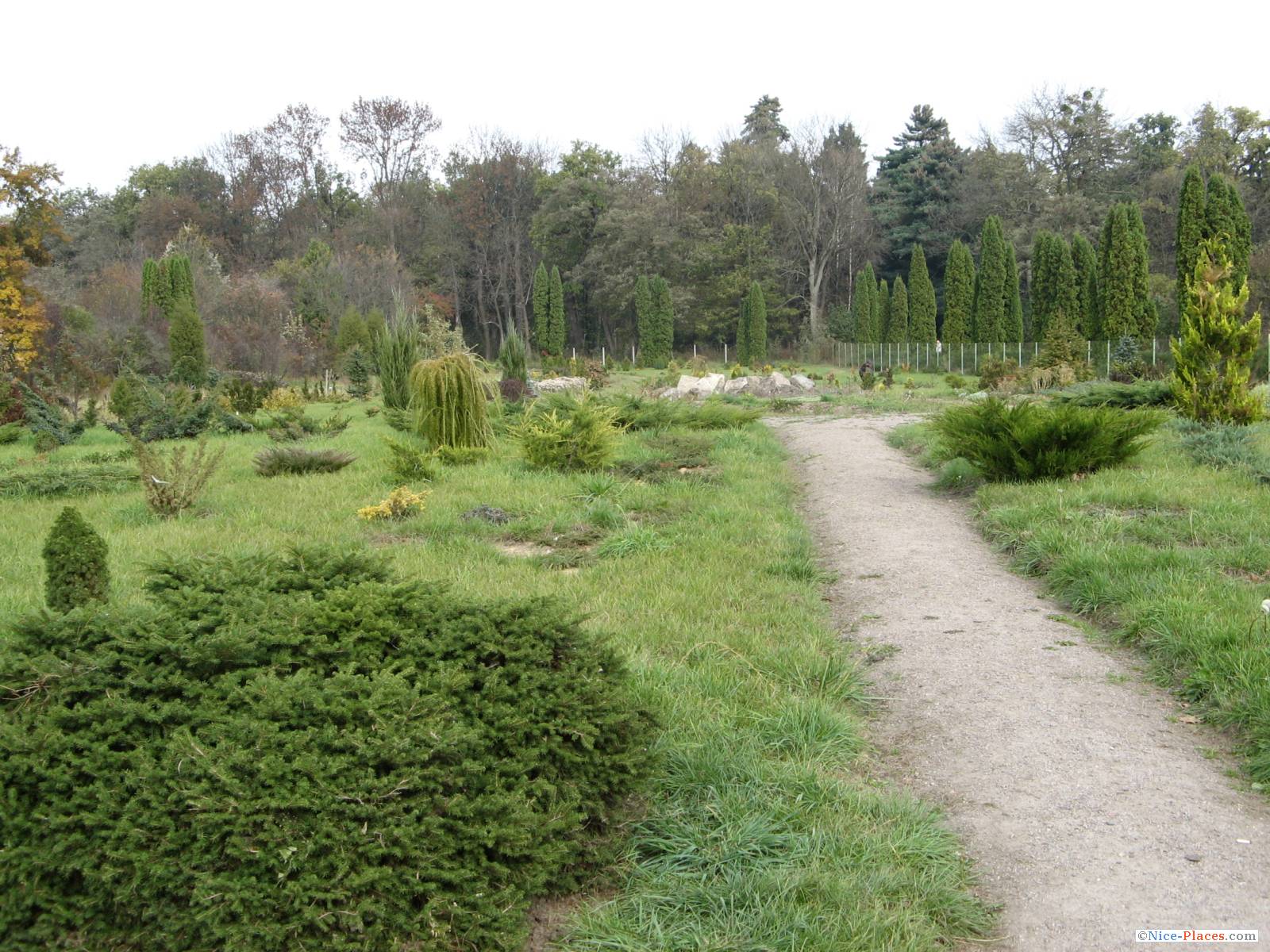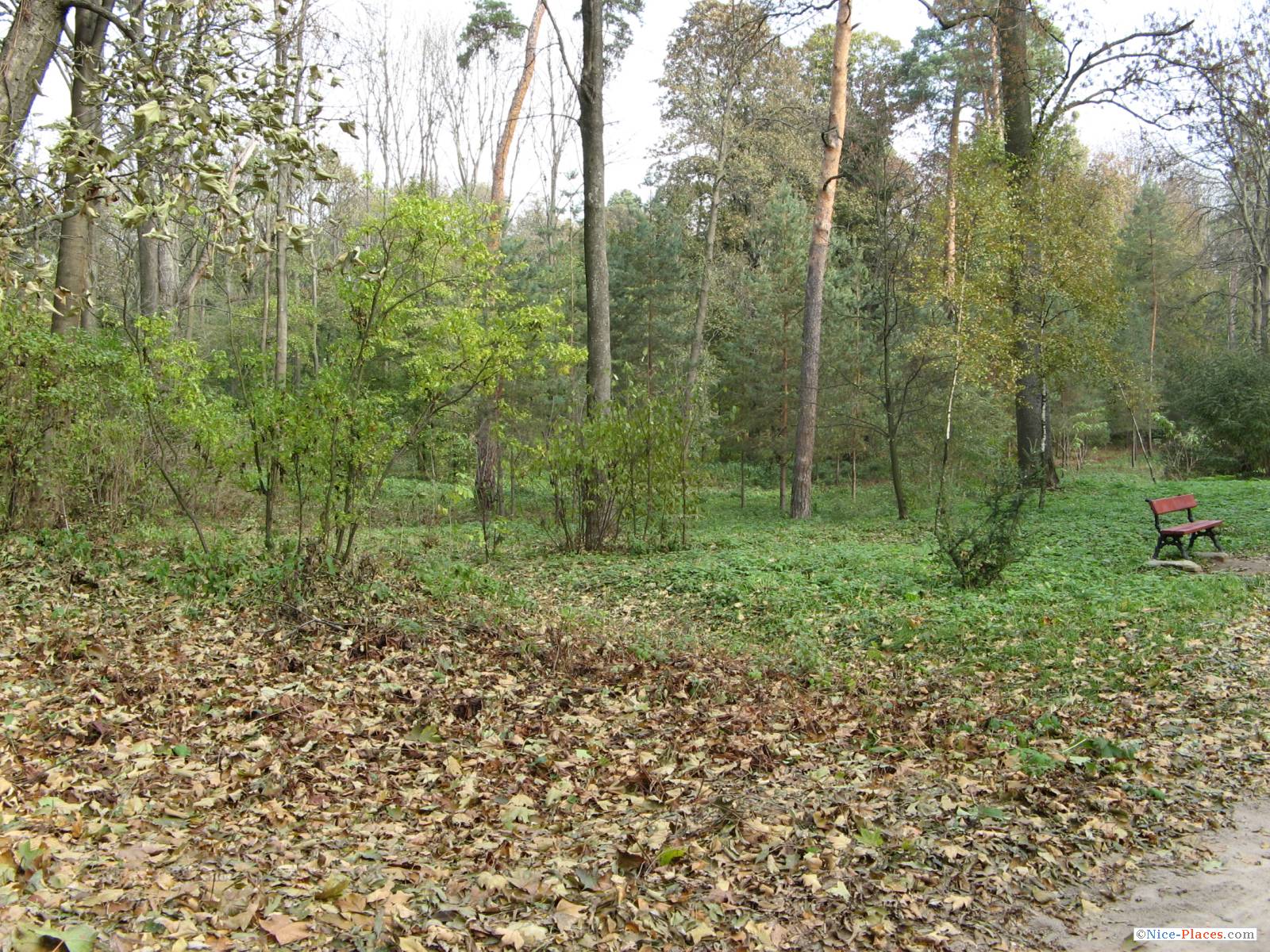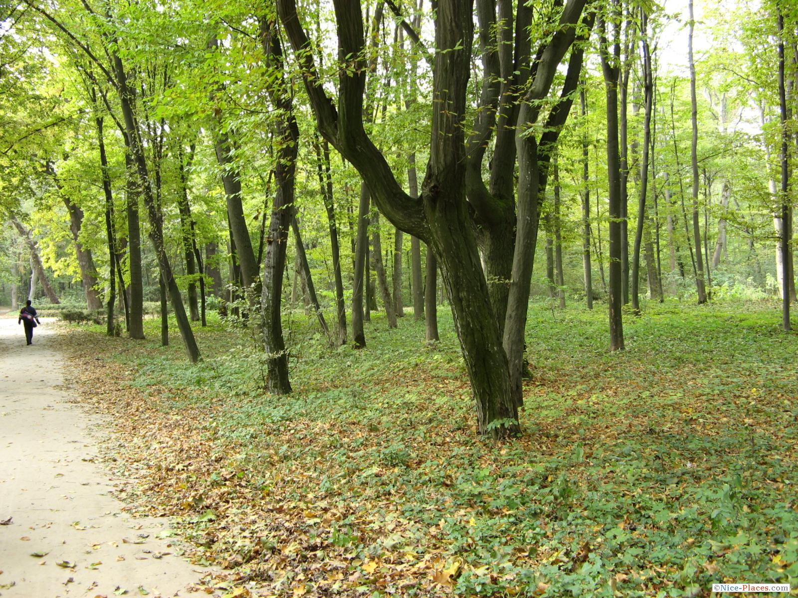 По всему парку — аллеи, аллейки, тропки. На аллеях часто попадаются лавочки, и возле каждой обязательно — небольшая, размером с ведро, урна, причём она наполовину вкопана в землю, то есть она не особо-то и портит вид. :-) Хватает и статуй, но они не массивные "железобетонные", а изящные, литые, из бронзы или чего-то наподобие. Есть и постройки: ротонда, несколько альтанок, колонны... А еще есть колоннада, это колонны в два ряда, накрытые крышей, выстроенные почти полукругом, и в причём в одном ряду колонны соединены стеной. Там удивительная акустика: в некоторых местах звук глушится, а в некоторых местах есть эхо. А еще можно стать в одном конце колоннады и негромко что-то сказать, а в другом конце колоннады будет всё очень хорошо слышно — удивительно.