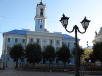 Далее выходим на Центральную площадь — сердце города, которая в прошлом носила название площадь Рынок. На площади множество старинных, но хорошо сохранившихся зданий. Но главный интерес представляет городская ратуша. Ее строительство велось в 1843-1847 гг. Здание возводилось монументально, навеки. Так котлован под башней был выкопан глубиной 6 метров. Размеры строения составляют 41,2 метра по фасаду, 37 метров со стороны улицы Главной, 46 метров со стороны ул. И. Франко. Над всем сооружением возвышается 50-ти метровая двухярусная башня с балконами, которую венчают шпиль и часы.Улица Русская выведет нас к греко-католической церкви Успения Пресвятой Богородицы, построенной между 1829 и 1821 годами.