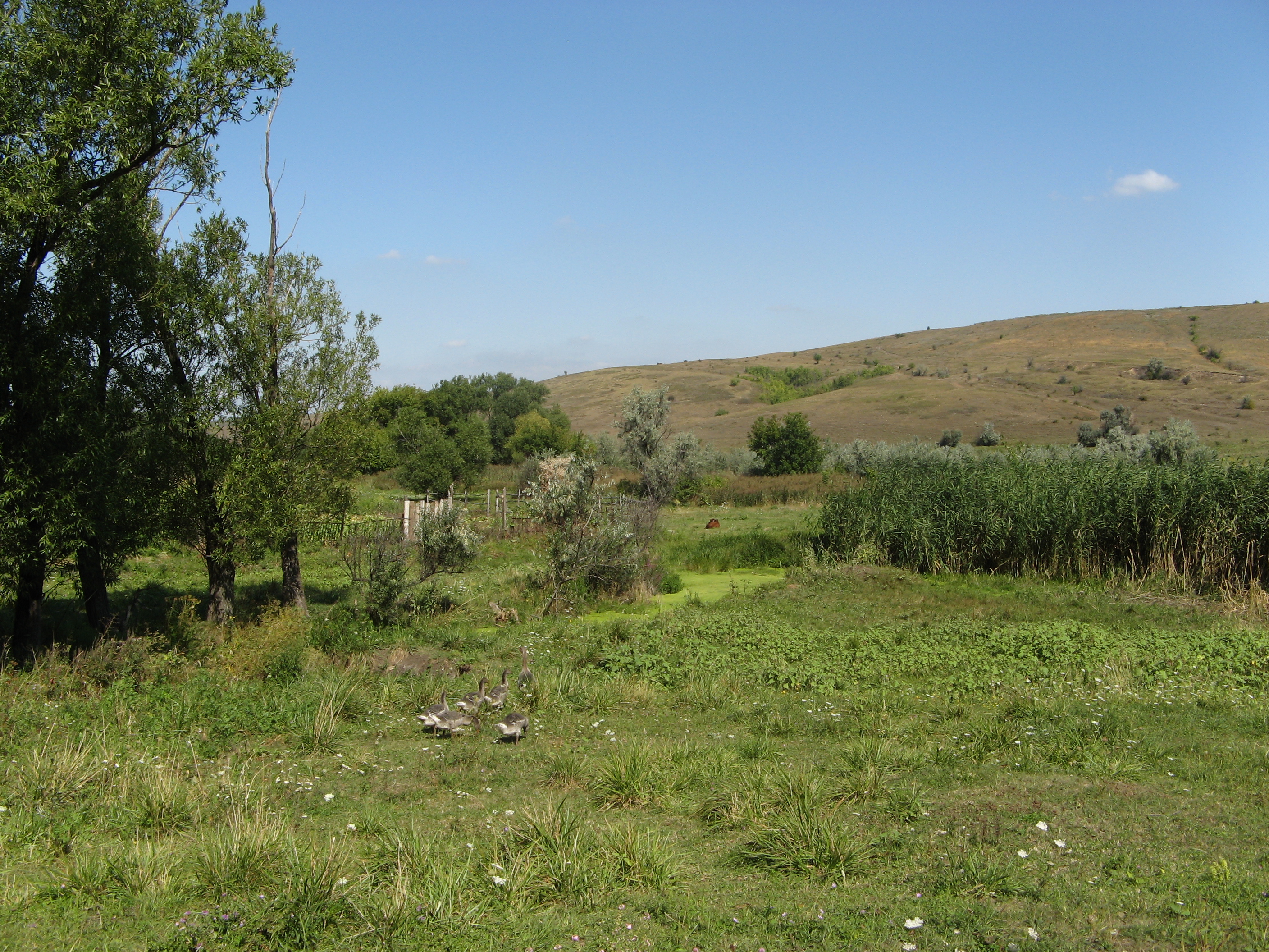 Первое, что поражает после города — это необычайная тишина, не абсолютно-беззвучная, а наполненная пением птиц, звуками насекомых, шелестом листьев. Красивая лесостепь, ручей, гуляющие на краю села гуси — уже этого достаточно, чтобы сказать «не зря мы сюда приехали!». Сделав небольшую остановку на берегу ручья (отличное место для маленького пикника!), двигаемся дальше, в гору.