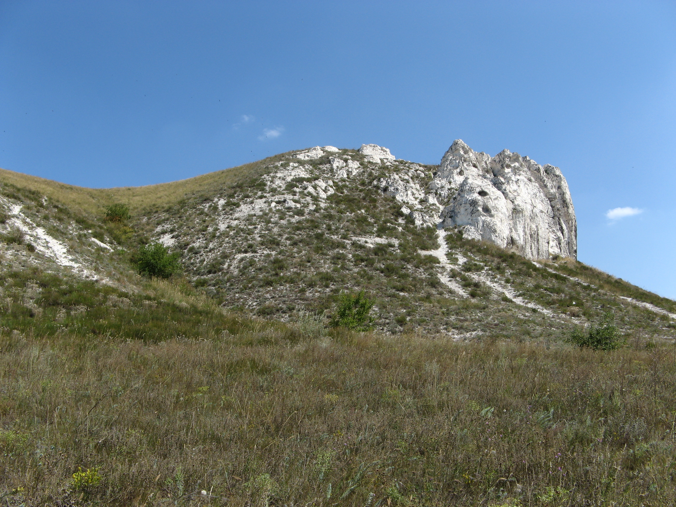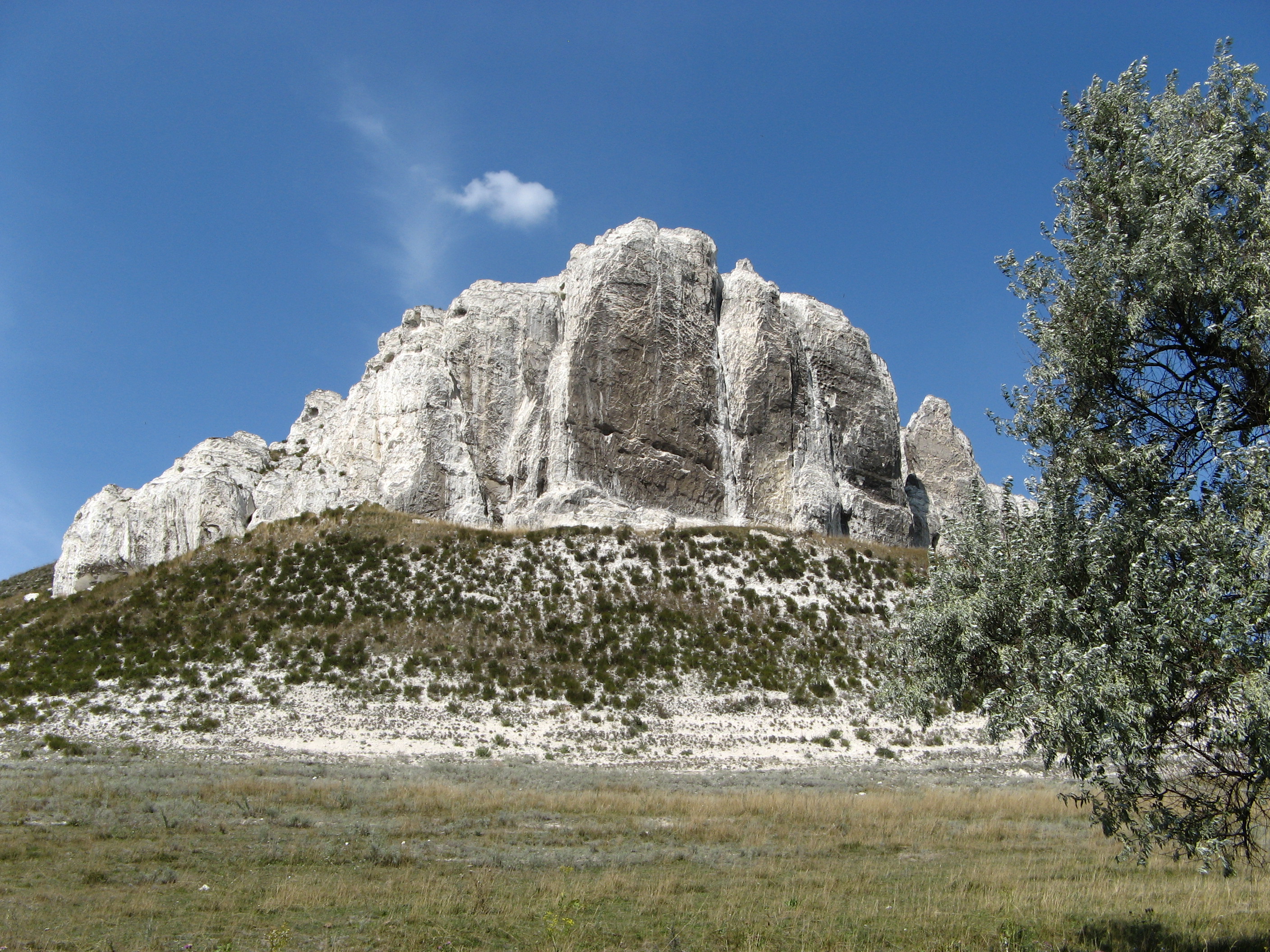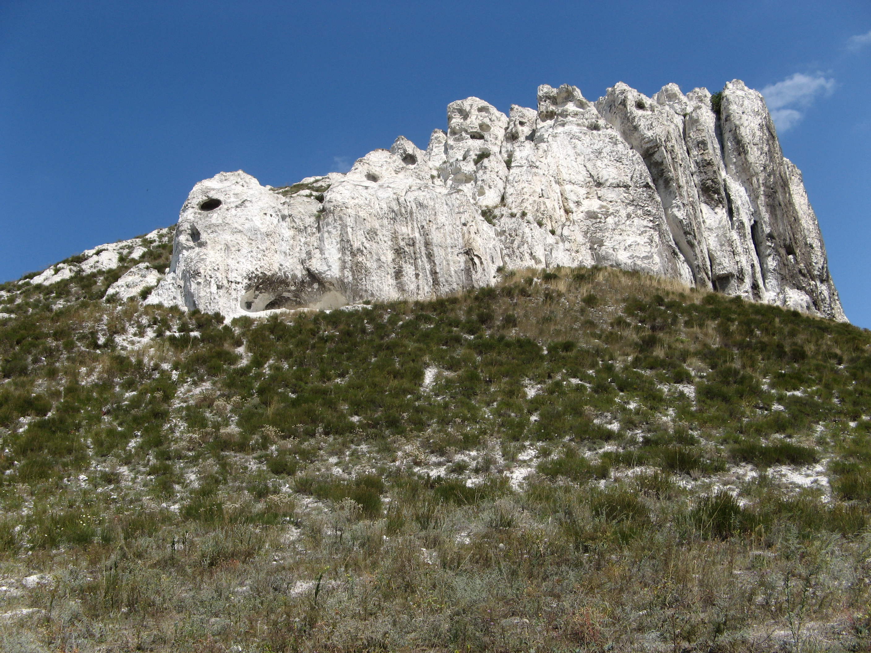Вот какую информацию удалось найти по этому месту. Белые меловые скалы, которые возвышаются над степью, образовались в эпоху мезозойского периода из рыхлого морского осадка древнего моря. Оголение меловой породы поднимается на высоту более 25 метррв. На восточной околице оголения стоит гора Меч. Возраст меловой горы около 90 млн. лет! У подножия горы расположены множество других более мелких скал, выбоин, большие и малые пещеры.
