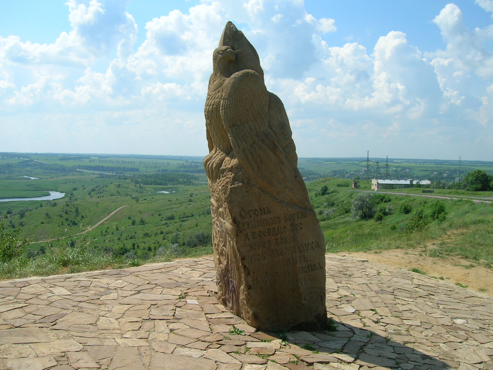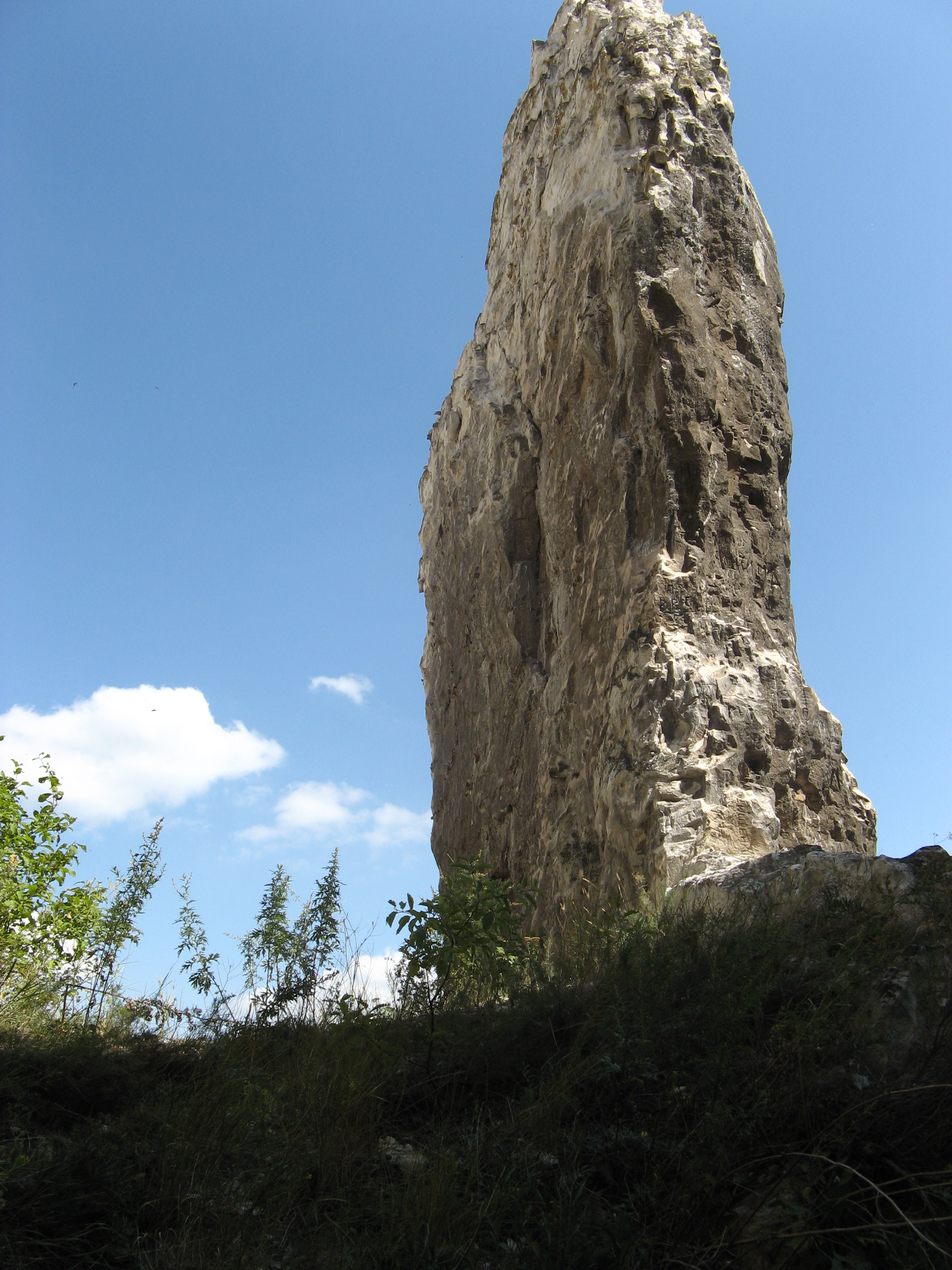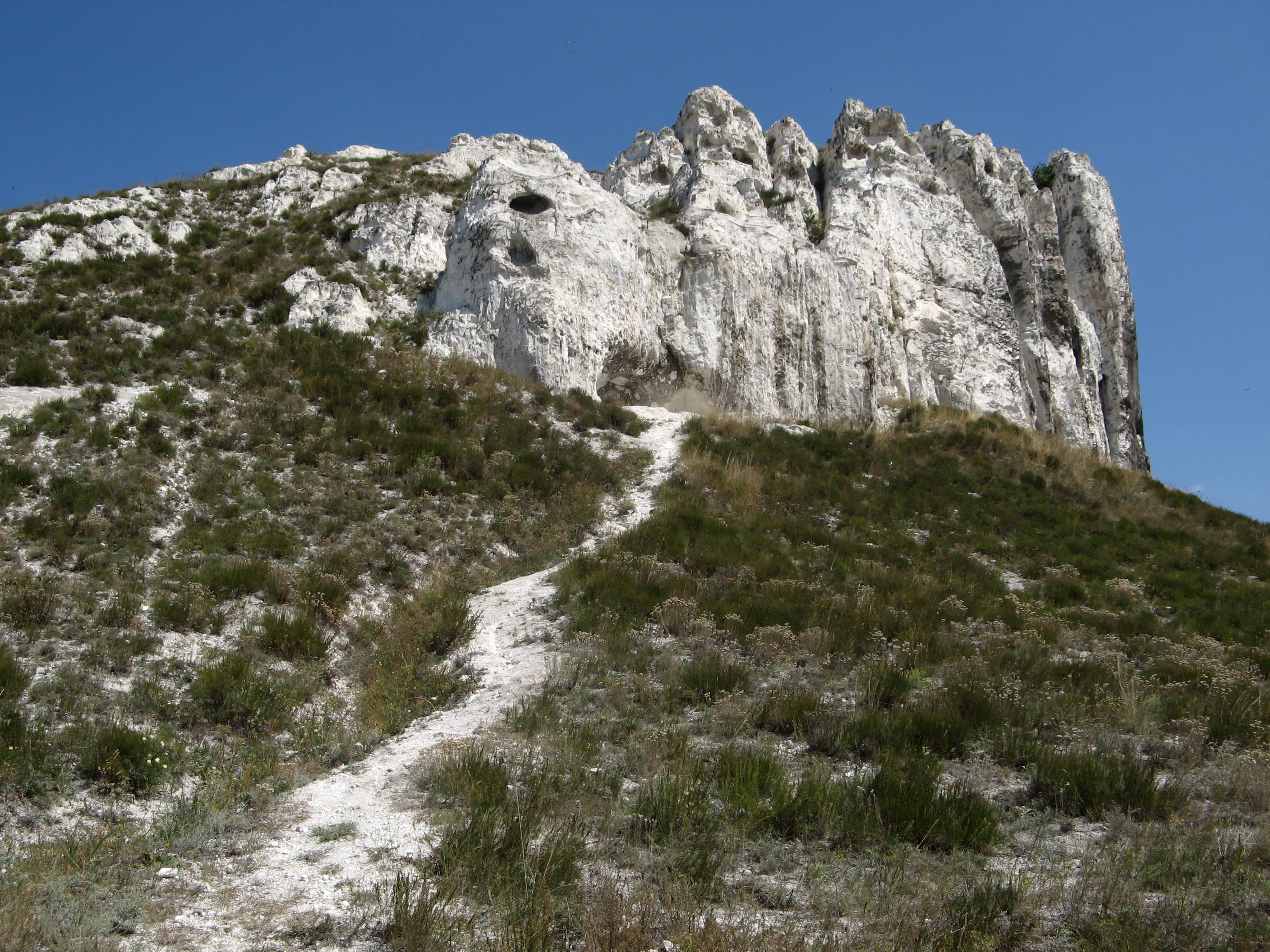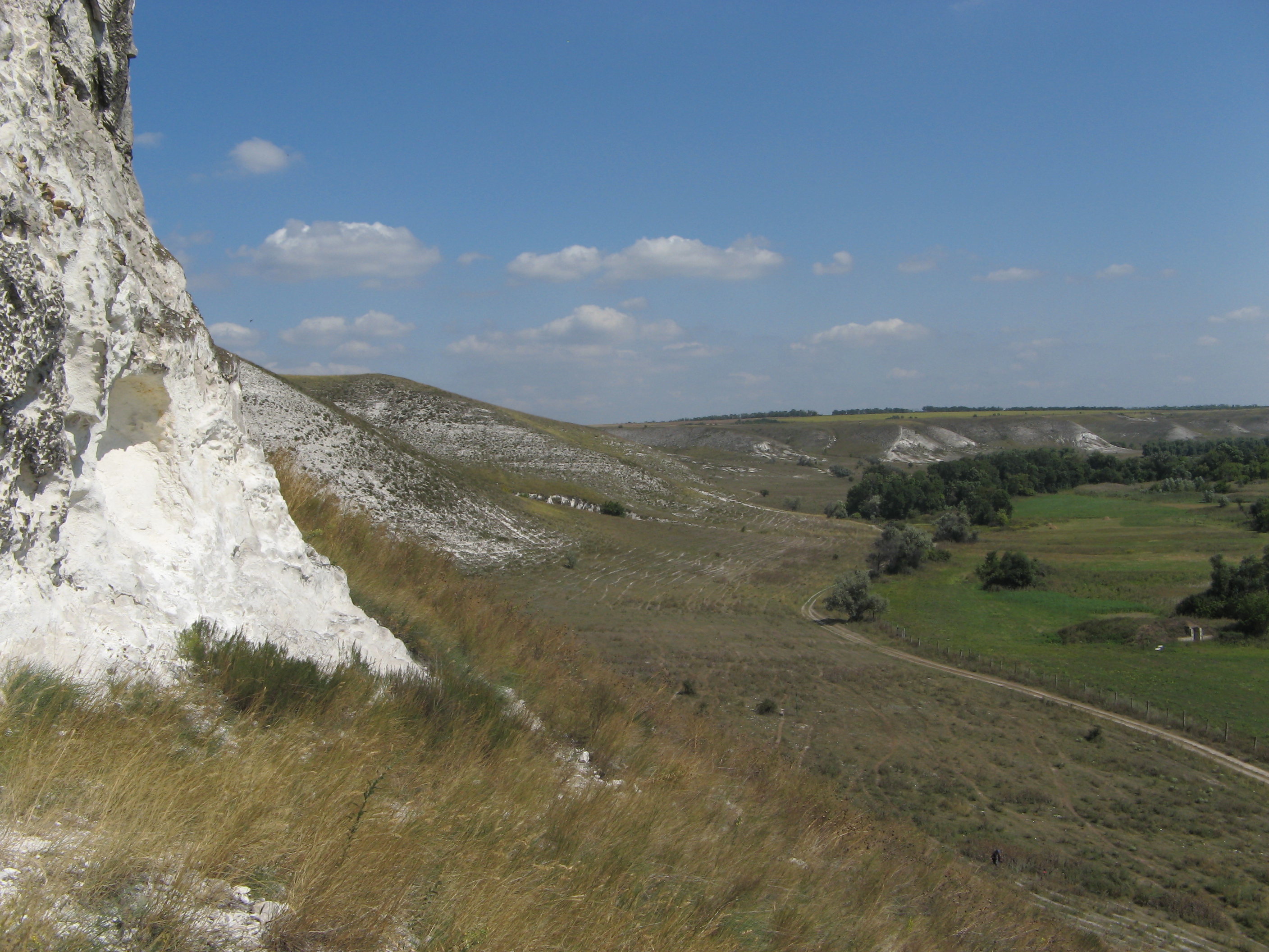 Вот какую информацию удалось найти по этому месту. Белые меловые скалы, которые возвышаются над степью, образовались в эпоху мезозойского периода из рыхлого морского осадка древнего моря. Оголение меловой породы поднимается на высоту более 25 метррв. На восточной околице оголения стоит гора Меч. Возраст меловой горы около 90 млн. лет! У подножия горы расположены множество других более мелких скал, выбоин, большие и малые пещеры.