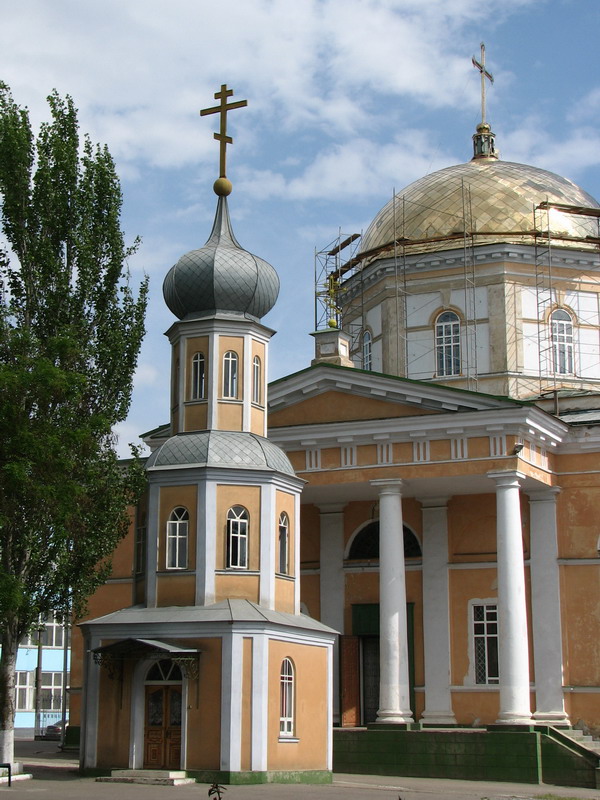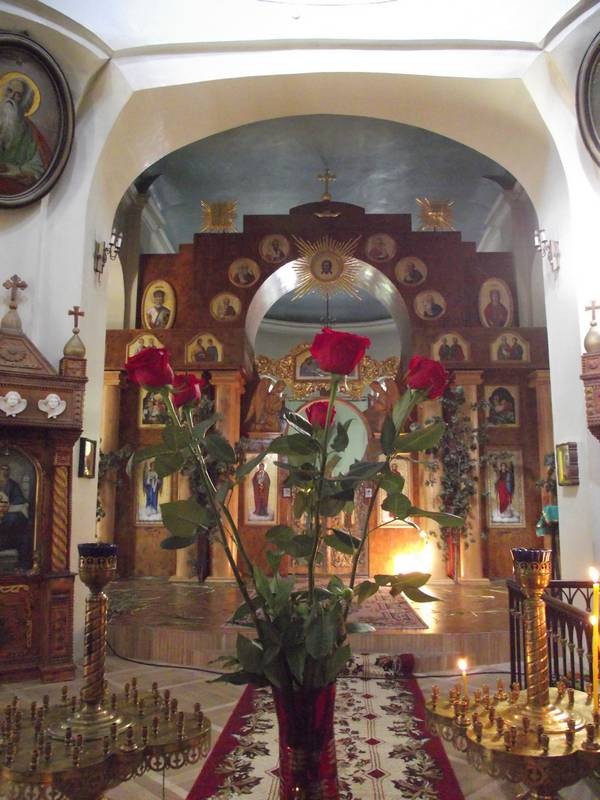 Вот за ветвями деревьев проглядывается церковь Александры Великомученицы. Она была построена в 1905 году на территории женской гимназии. Не смотря на довольно глубокие трещины на стенах, выглядит храм как теремок, сошедший с лубочных картинок.