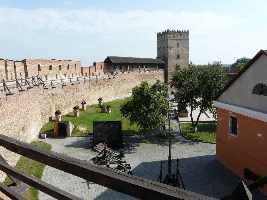 Луцкий замок состоял из двух частей – Верхнего замка и Нижнего замка. К сожалению, до наших дней дошел в первозданном виде лишь Верхний замок, от Нижнего замка остались лишь руины. На строительство мощного каменного замка, окруженного крепкими оборонительными стенами, ушло более сорока лет. Строительство замка началось с возведения башен с бойницами, над рекой Стырь была возведена Стыровая башня, ставшая главными воротами Въездная башня и Владычья башня, и только после этого все три башни были соединены между собой оборонительными стенами. Форма замковой территории напоминает треугольник, и такая форма была выбрана не случайно – она наиболее подходит в силу особого рельефа местности замкового холма. Мощные оборонительные стены были построены на самом краю возвышенности, что делало замок практически неприступным. И действительно, он выдержал много осад, и, несмотря на многочисленные армии неприятелей, Луцкий замок ни разу не удалось захватить. За оборонительными стенами находились глубокие рвы и высокие валы, а попасть на территорию замка можно было лишь по подъемному мосту, опускавшемуся с помощью цепового подъемного механизма.