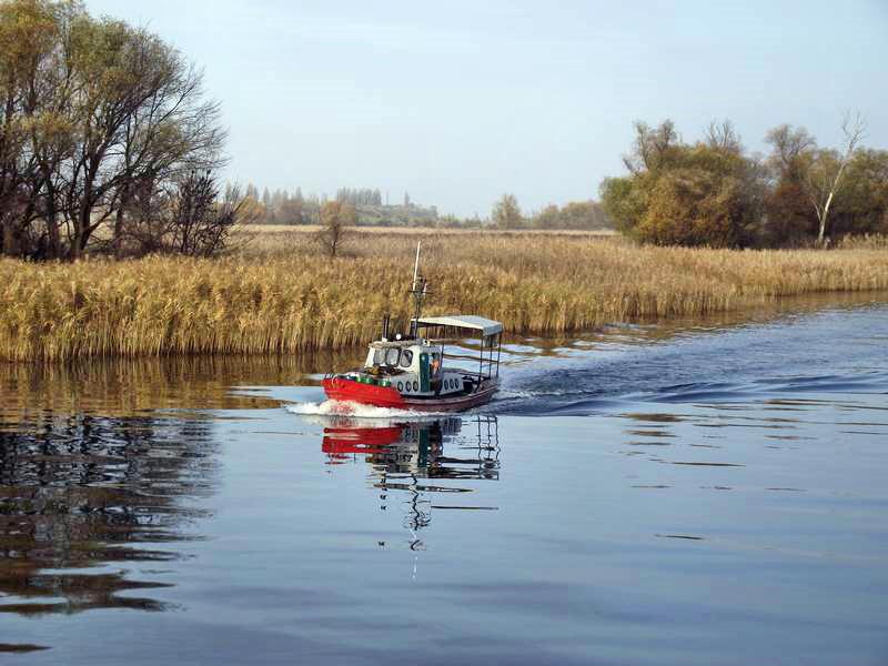 Здесь приходится пересаживаться на корабль. Хотя назвать его таким сильно громко будет сказано. Обыкновенный речной трамвайчик или по простому «лапоть». Зато с гордым именем «Эколог». При всем его неказистом виде этот транспорт отличается большой надежностью и неплохим уровнем комфорта. К тому же его малая осадка позволяет забираться в самые отдаленные уголки днепровских плавней. А они начинается буквально в черте города.
