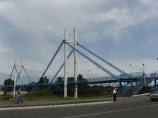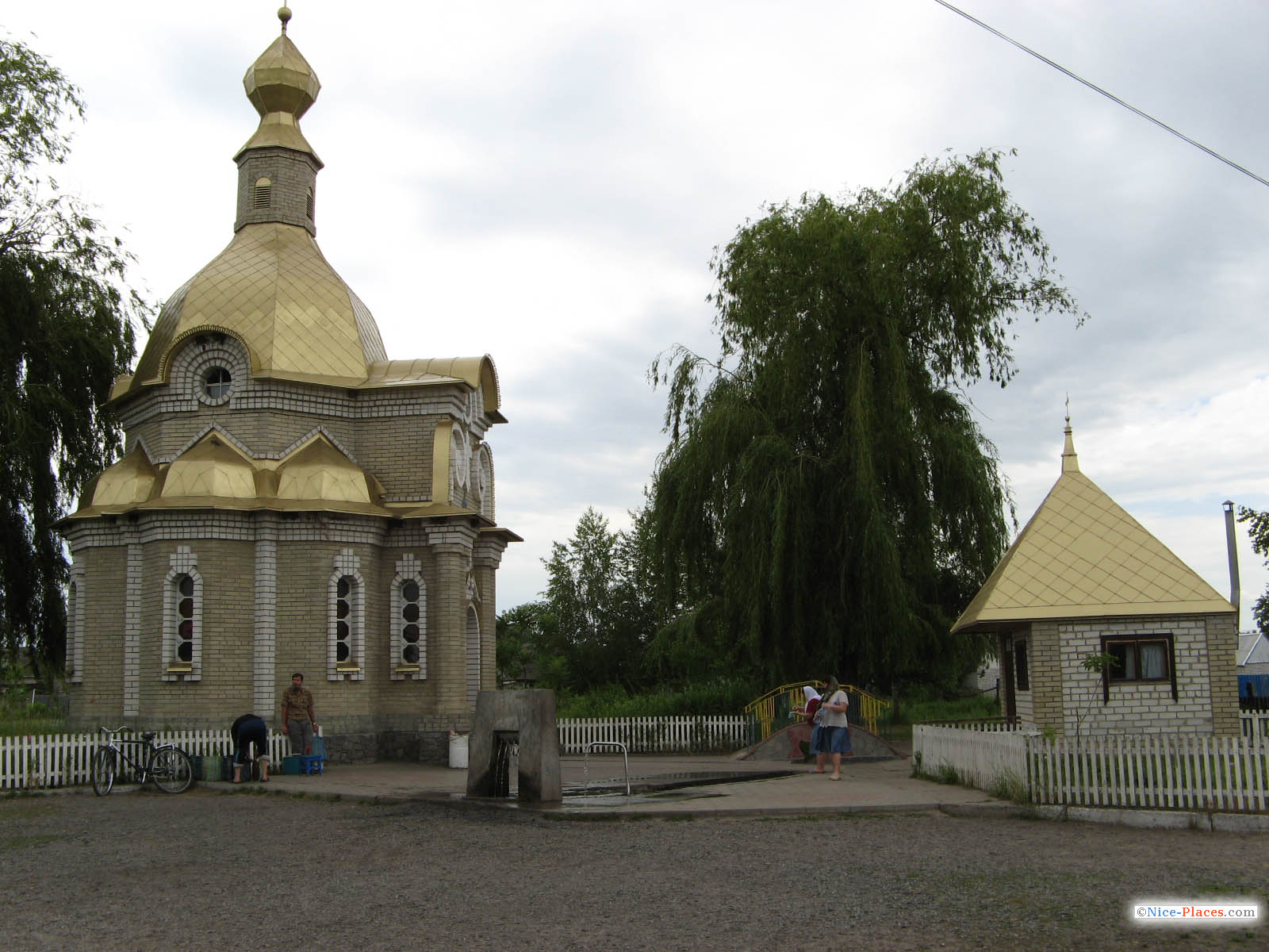 Далее мы направились к наиболее значимому храму города — Свято-Вознесенскому собору. Путь проходил через новый пешеходный мост через Северский Донец. На мосту волей-неволей задерживаешься — открывается очень красивый вид на реку, слышны голоса каких-то необычных птиц, а еще недалеко видели настоящего живого аиста в гнезде.