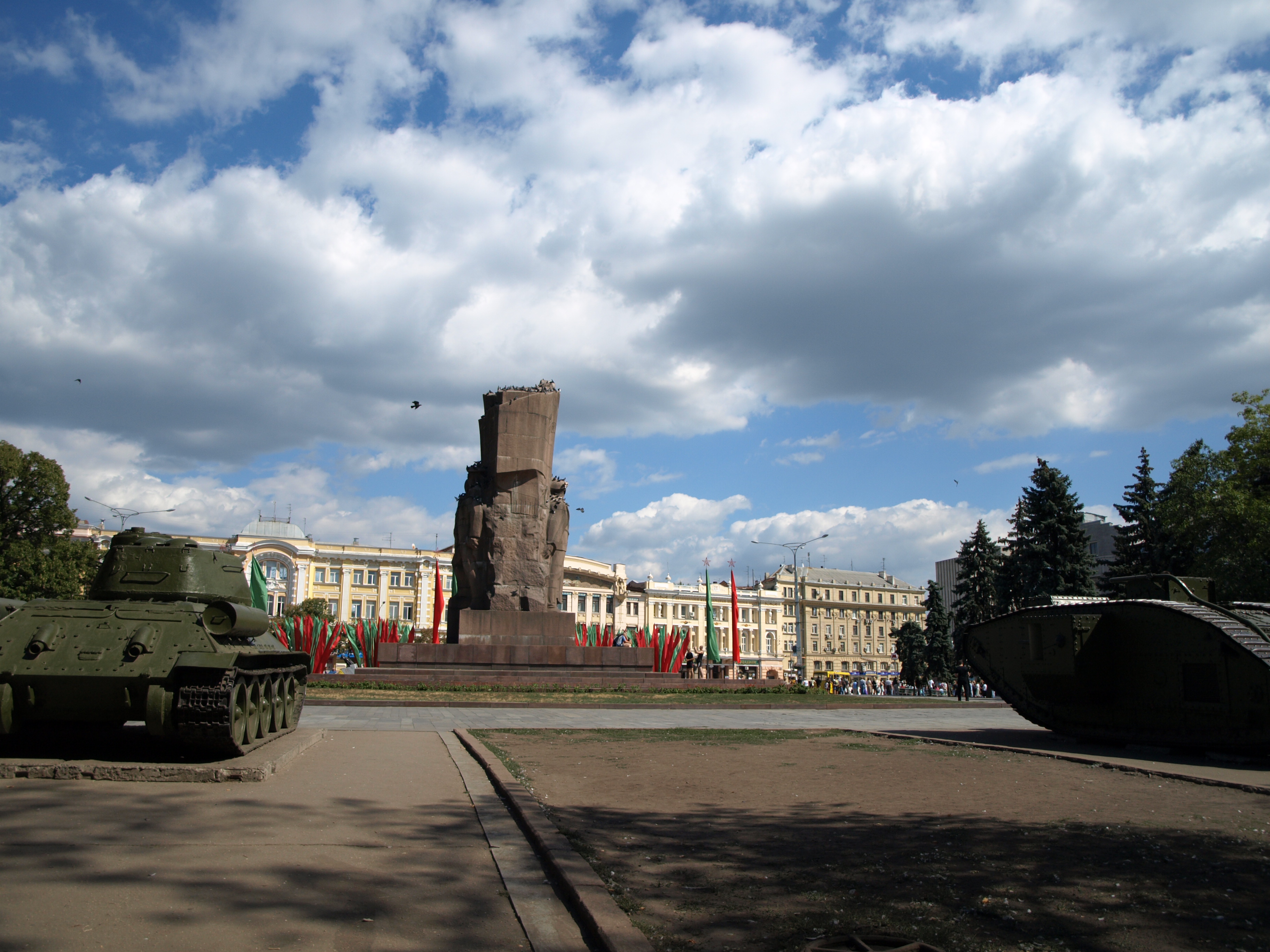 Отдохнув, мы продолжим путь по Сумской улице, которая приведёт нас к площади Конституции. По её периметру расположены здание Горсовета, магазин «Детский мир», и дом со шпилем, силуэт которого стал одной из визитных карточек города. На площади находится памятник, называемый в народе «Трое несут холодильник», а также, советский и английский танки, любимцы детворы. Между прочим, название в честь Конституции — пятое название этой площади. Так отражаются исторические перипетии в биографии наших городов!