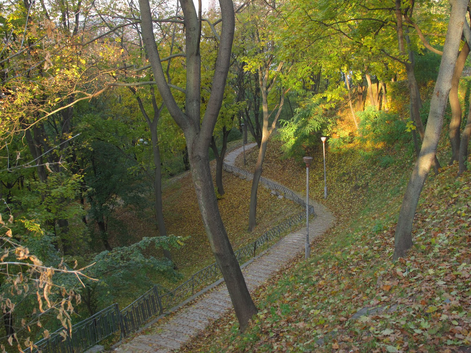 С противоположной, южной стороны Старокиевской горы раскинулось поистине сказочное место – Пейзажная аллея. Это детский парк, созданный силами киевлян и многочисленных спонсоров. С Пейзажной аллеи можно полюбоваться чудесной панорамой современных «игрушечных» домиков, выросших в низинной части древнего города Подоле на месте ремесленных мастерских гончаров и кожемяк. Любуясь красочными жилыми домиками, уютно расположившихся среди вековых живописных деревьев, можно умиляясь, порадовать себя известными киевскими сладостями в одном из ресторанов «Чайкофф».