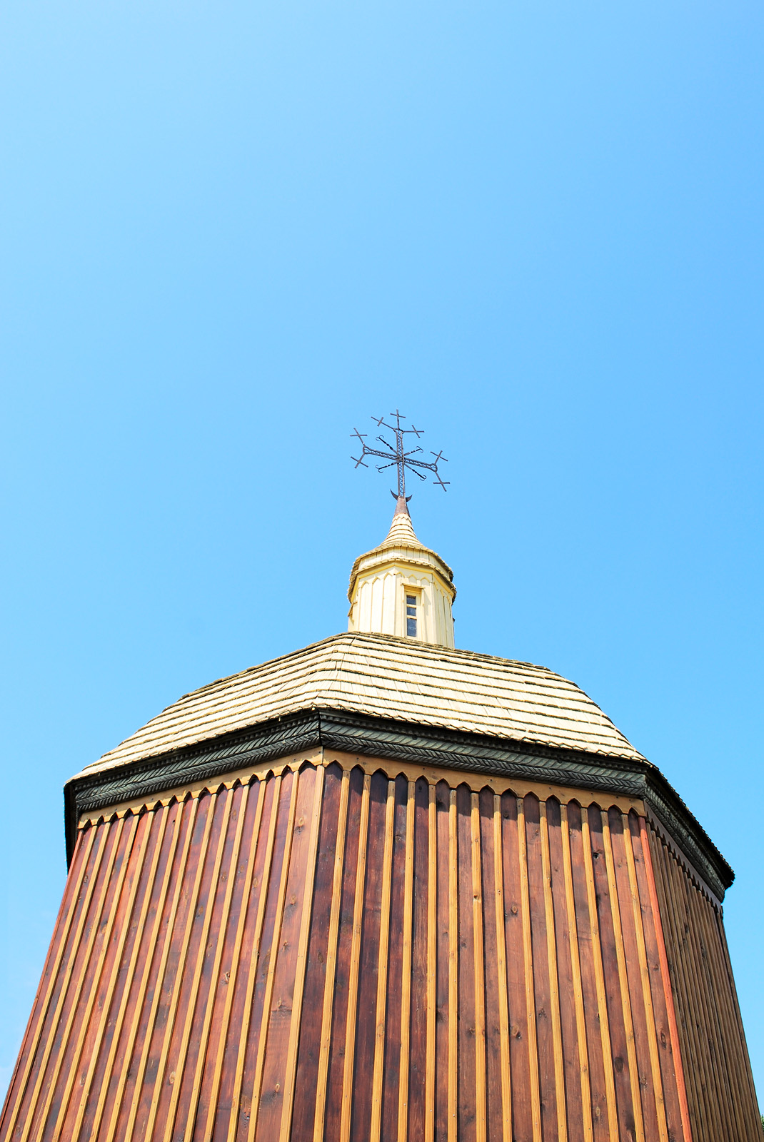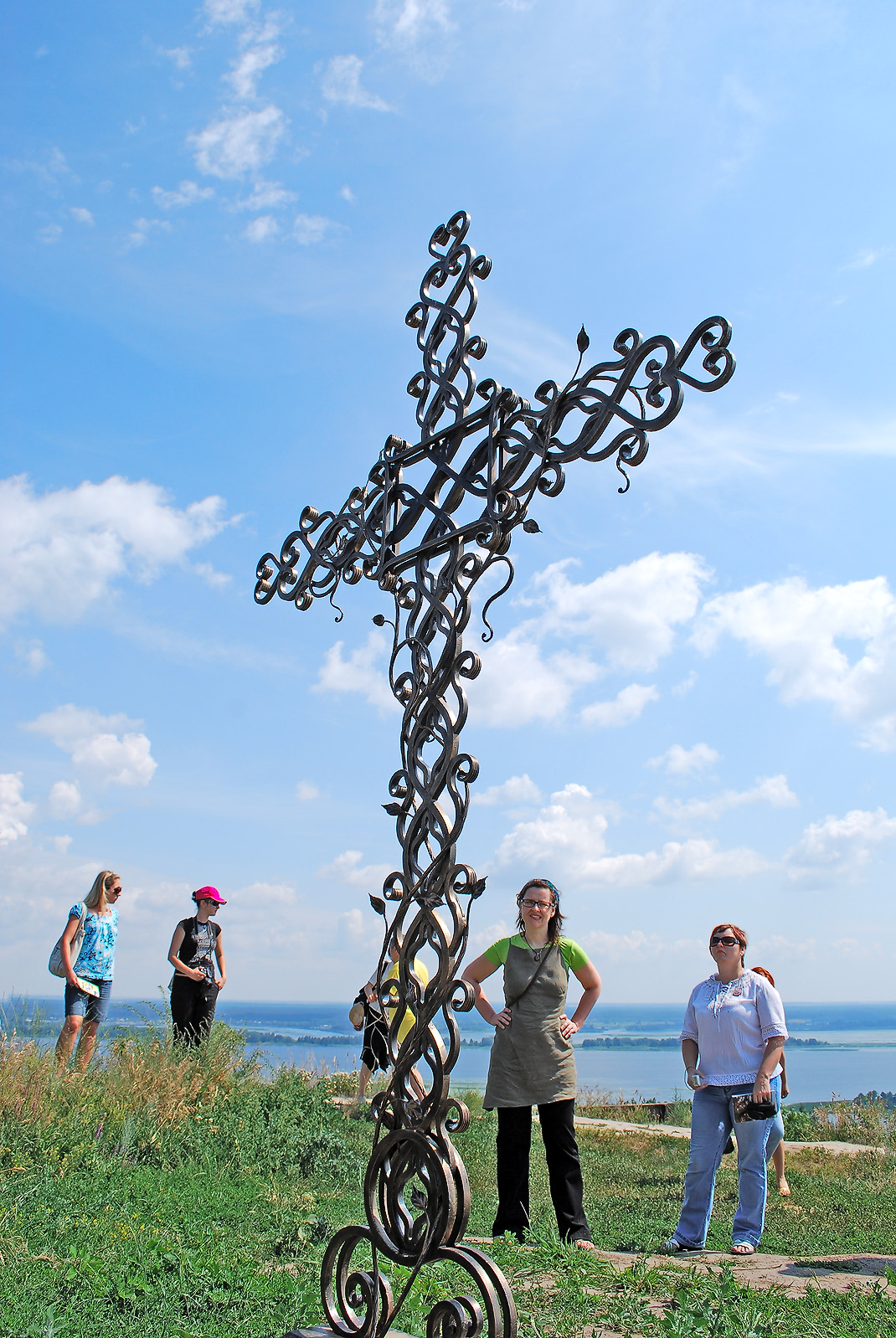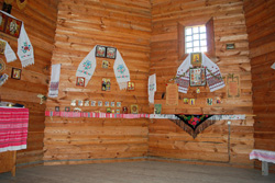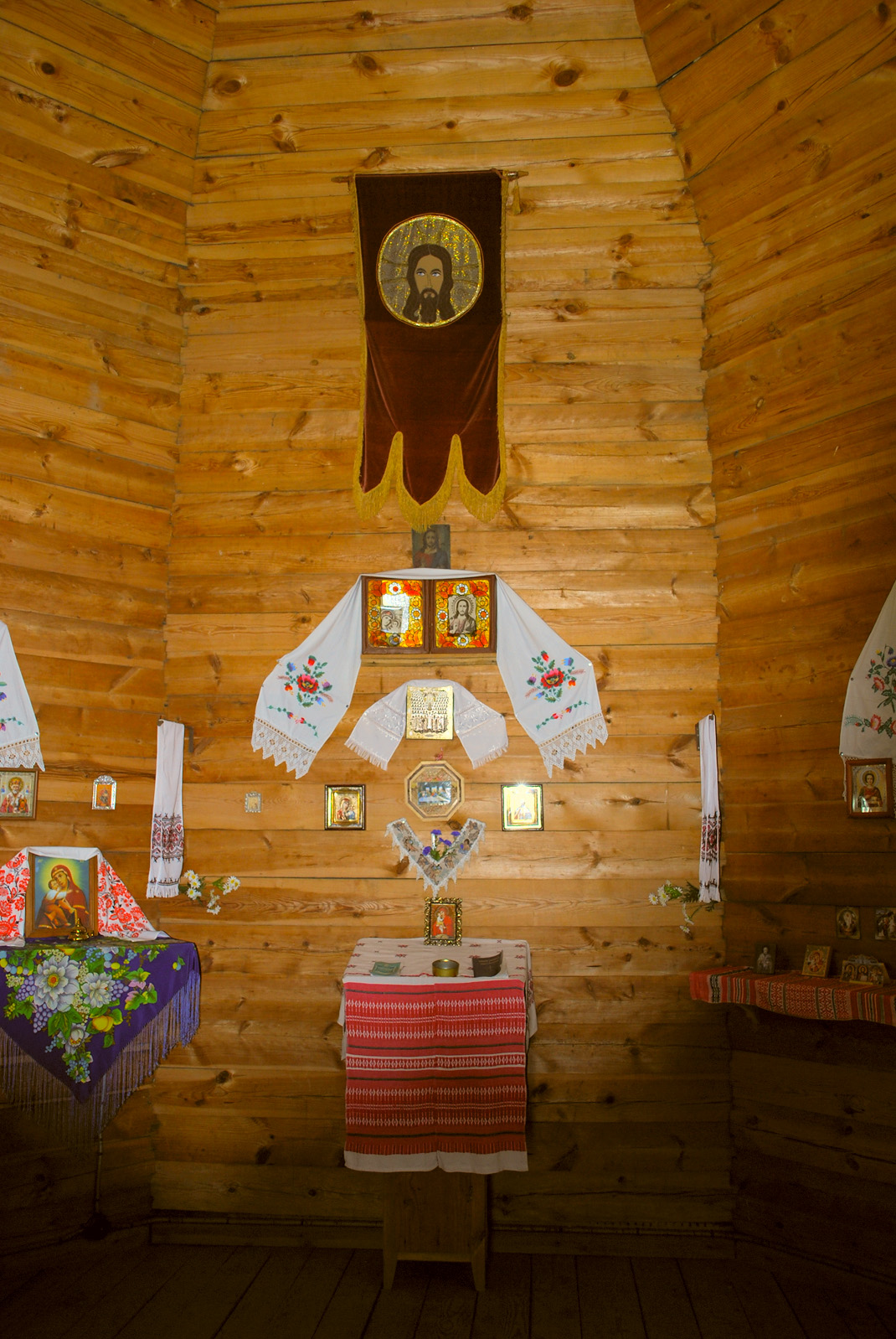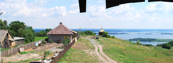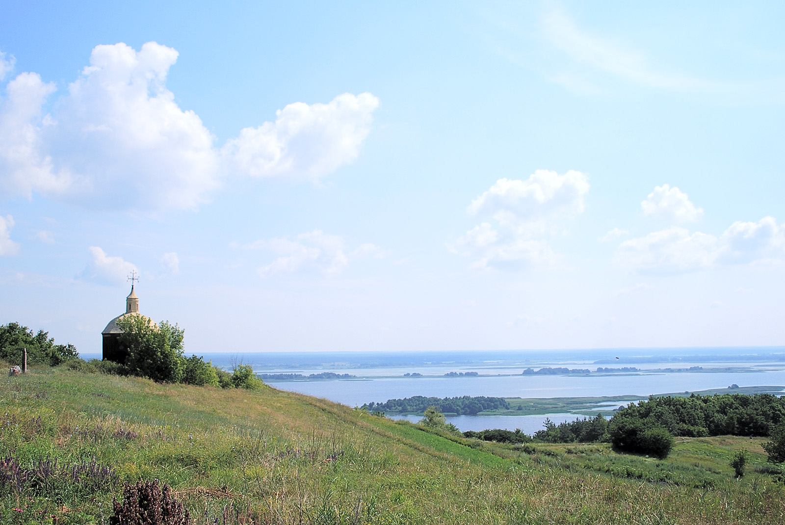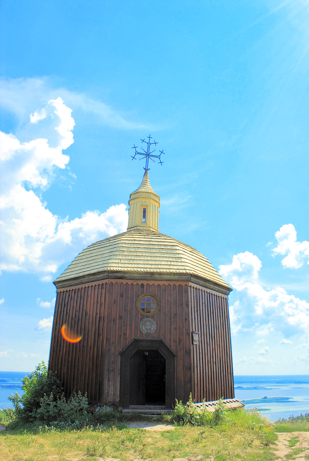 Выходим на околицу деревушки, туда, где стоит старенькая ветряная мельница, и рука абсолютно бессознательно тянется к фотоаппарату. Перед нами предстает Днепр в одной из своих величественных ипостасей: дальний берег еле различим, а водную гладь прорезают зеленые островки. Истинно княжеское место, возвышающееся над водами реки почти на 70 метров. Два плато, разделенные яром — это практически все, что осталось от городища Х века, но постояв здесь всего несколько минут, начинаешь ощущать особую энергетику. А затем это ощущение многократно усиливается при входе в деревянную часовенку с причудливым крестом на куполе. Сюда еще не добрались остальные участники экскурсии, поэтому тишина, незатейливое внутреннее убранство и расслабляющая прохлада только усиливают ощущение независимости от внешнего мира, ведь из под купола струятся киловатты древней энергии.