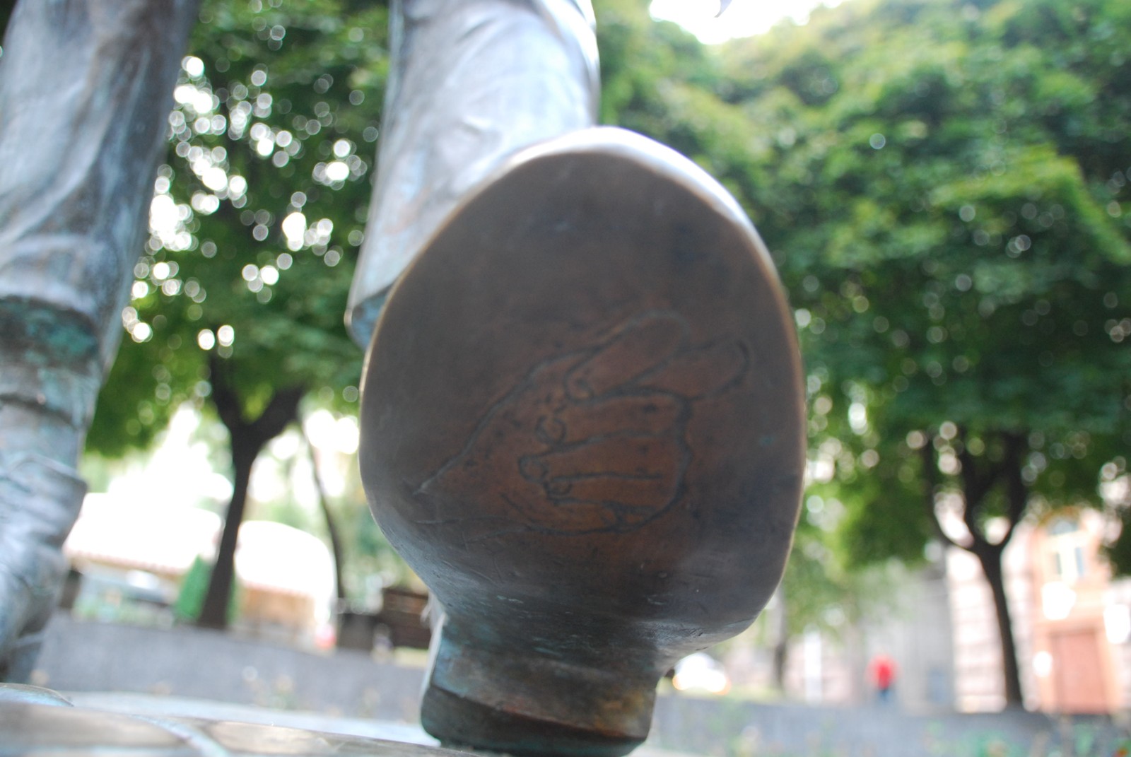 Памятник с сюрпризом. Памятник Паниковскому, одному из героев «Золотого теленка», находится на перекрестке Крещатика и улицы Прорезной. Памятник как памятник, правда, недавно хулиганы украли у Паниковского трость, что в принципе, не сильно помешало знаменитому персонажу. Да вот мало кто знает, что если посмотреть на подошву приподнятой ноги Паниковского, Вы увидите там…ни что иное, как фигу. Это, творчество скульпторов и авторов памятника.