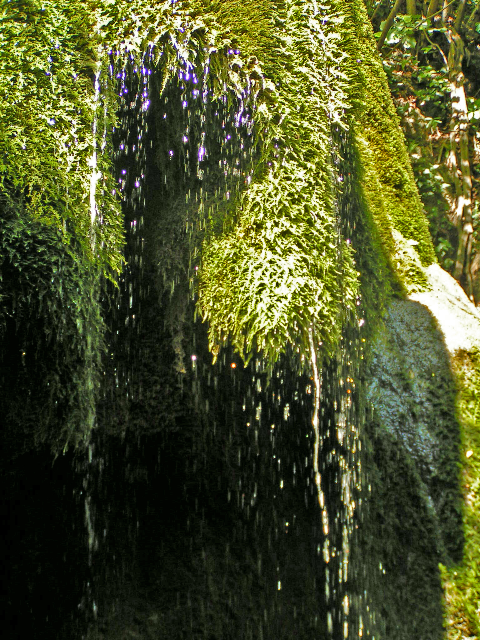 В жаркие дни лета вода бежит по камням тоненькими струйками на фоне небольшого грота, густо облепленного мхом. Если вам повезет и вы увидите водопад после обильных дождей или таяния снегов, то воды будет намного больше и зрелище будет еще более завораживающее.
