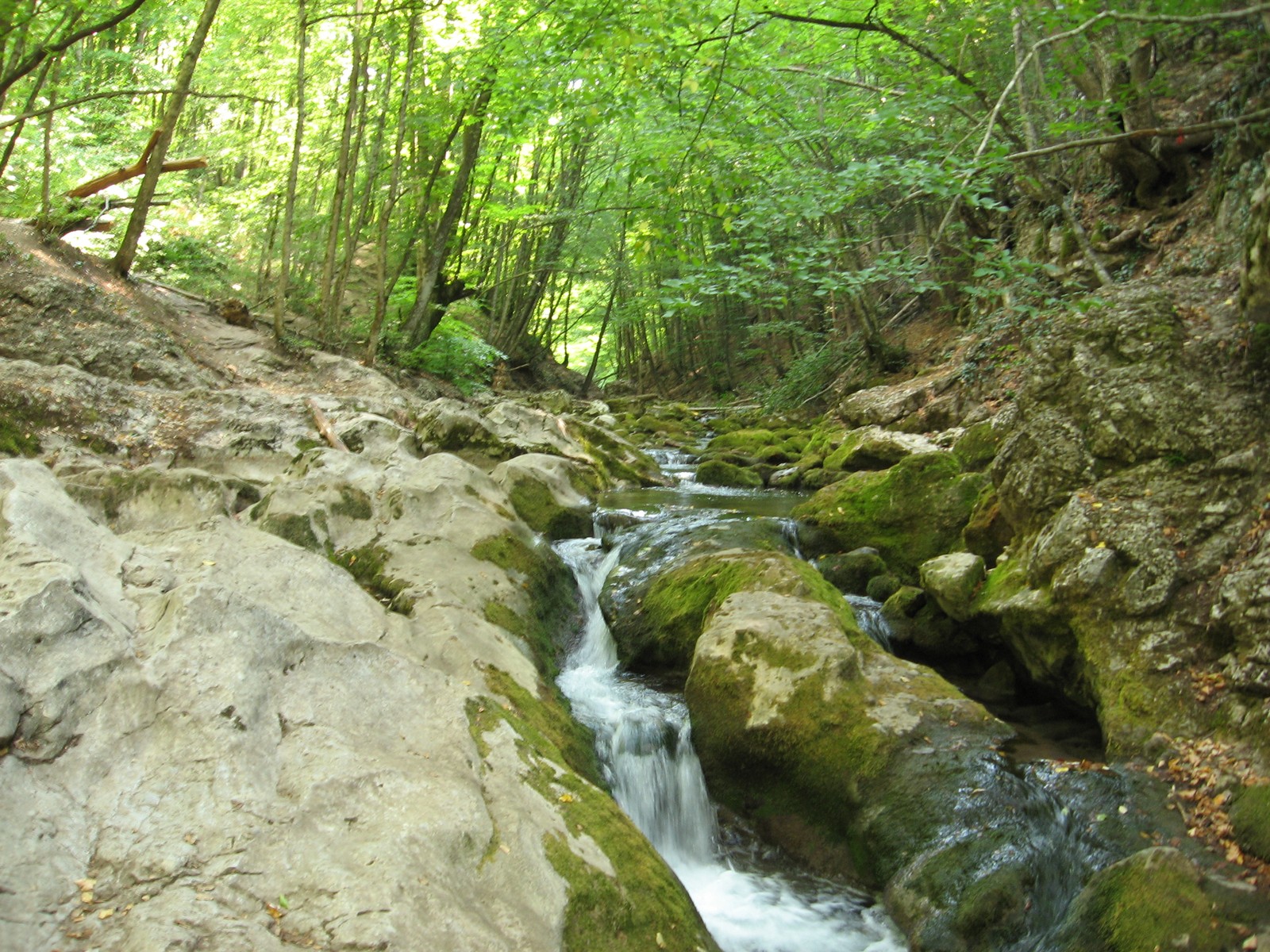 Идя по тропинке, доходим до карстового источника Пания и Яблоневого брода. Переходим на другую сторону реки. И движемся по ущелью, которое становится все уже и уже. В самых узких местах ширина каньона не превышает 3-5 м, здесь опасно даже громко разговаривать — возможны камнепады. Глубина ущелья достигает 320 м, длина — более 3-х км. В каньоне мало света: даже в разгар солнечного дня царит сумрак, и только далеко вверху сияет полоса голубого неба.