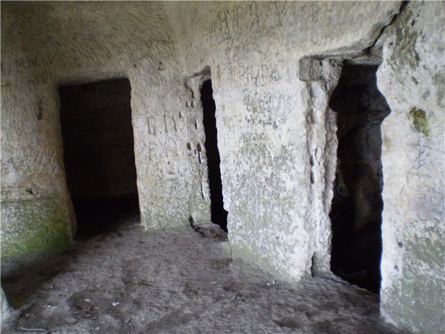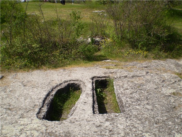 Вызывают интерес и пещерные казематы города Эски-Кермен, расположенные в разных частях города. Лучше всего сохранился каземат в западной части городища, составляющий единый комплекс с мощной оборонительной стеной. На уровне пола скальной породы проделаны шесть отверстий, через которые много веков назад мужественные защитники города сбрасывали тяжелые камни на головы осаждающих. В состав каземата входили пещерные кладовые, в которых до сих пор сохранились углубления для пифосов – огромных глиняных сосудов в человеческий рост, в которых хранилось вино, растительное масло, зерно и другие продукты. В других пещерах каземата можно увидеть вырубленные в скальной породе скамейки, предназначенные для отдыха воинов. Каземат соединялся перекидным деревянным мостом с зерновой ямой, мост до наших дней не сохранился.
