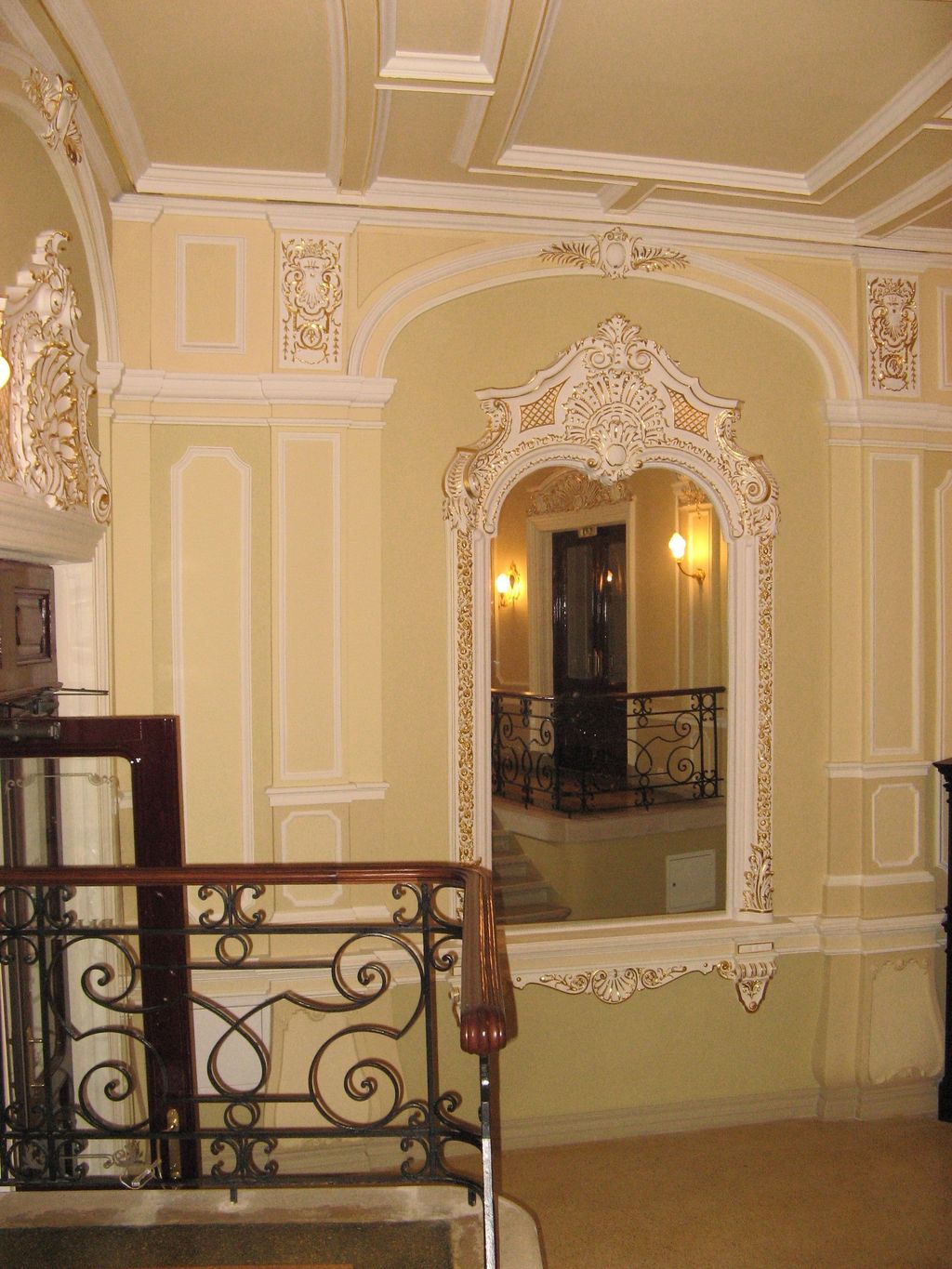 Зал, как и внутренний интерьер Театра, соответствует лозунгу: "Золотой форме — золотое содержание". Выполнен он в стиле Людовика VI — "Роккоко". Нижний этаж, партер и ложи бенуара, фойе в виде широкого, идущего полукругом коридора, перед ложами бенуара, богато украшенные лестницы. Сиденья и ложи обиты тёмно-красным бархатом, зеркала в золочёных фигурных оправах. Главный мотив орнамента — раковина в виде завитков различной формы. Рисунок орнамента нигде не повторяется.
