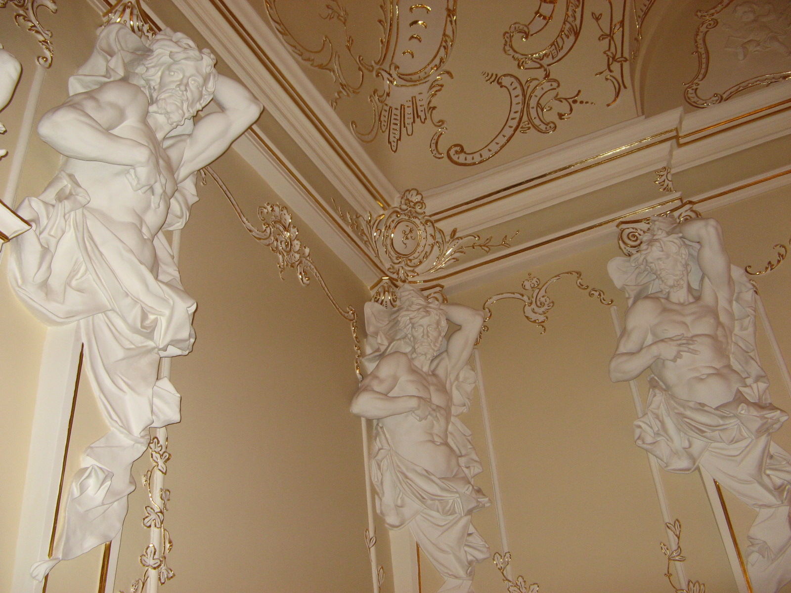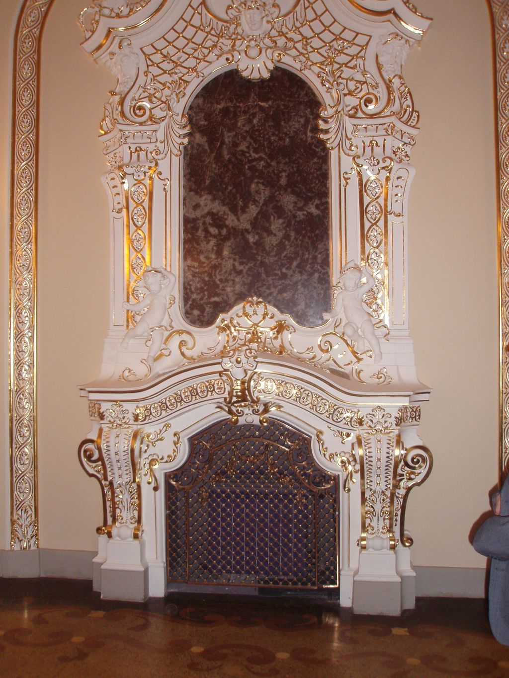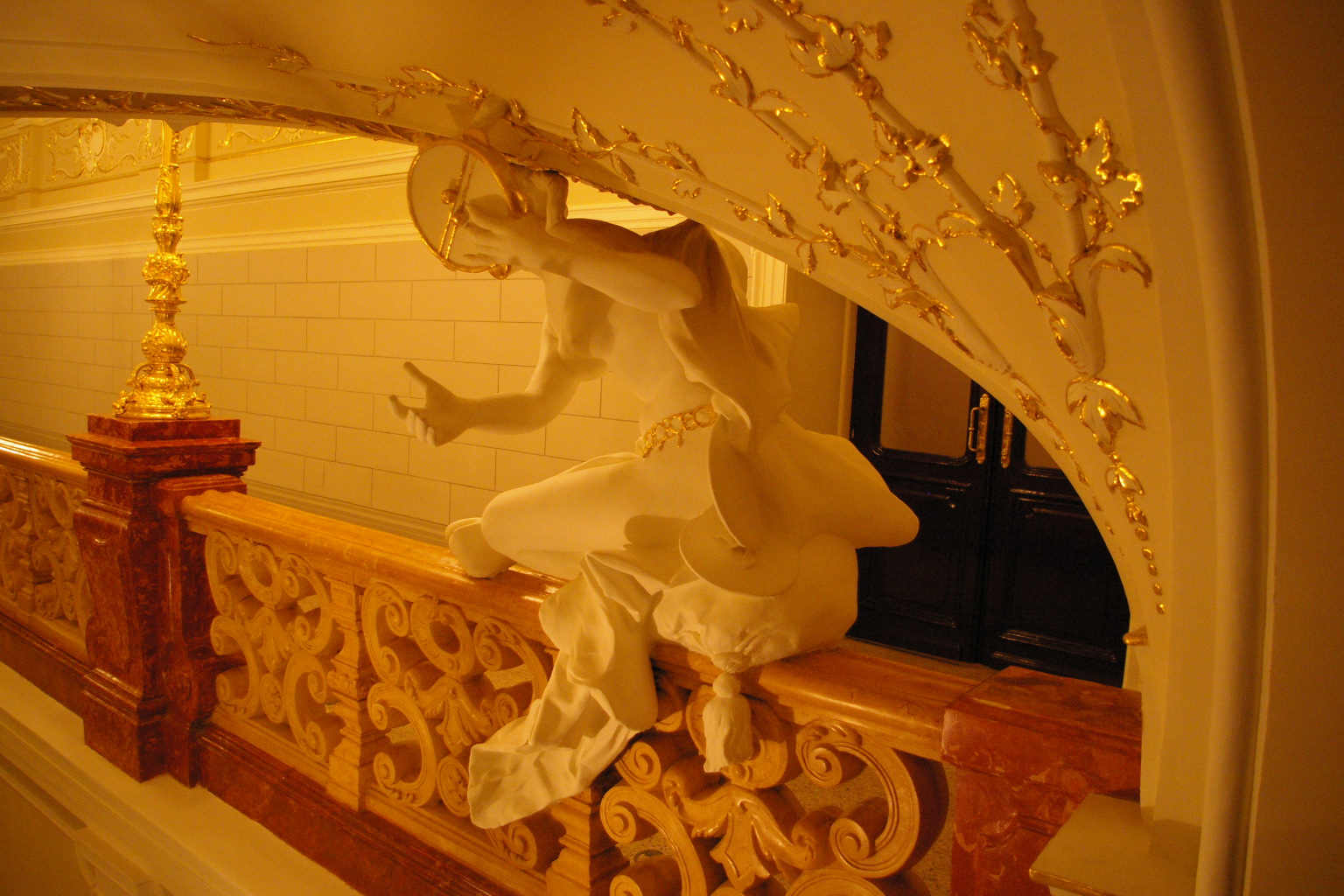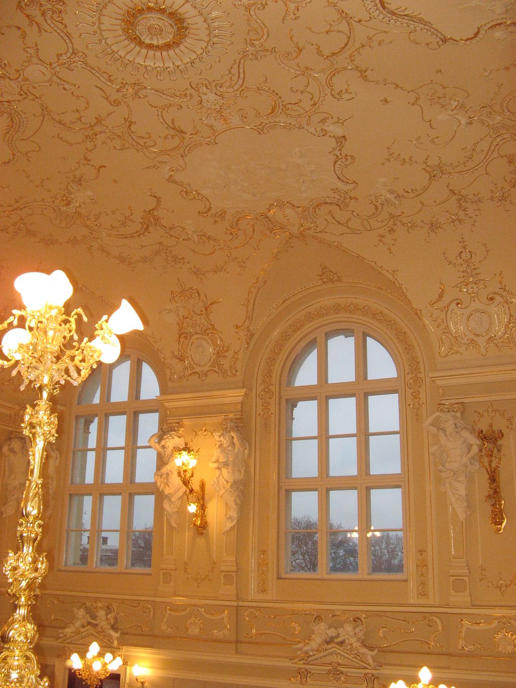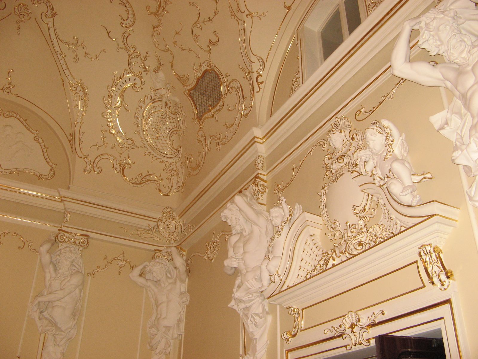 Одна из главных достопримечательностей зала роскошным цветком сияет люстра, переливаясь всеми цветами радуги, сверкают сотни хрусталиков. Высота этого хрустального чуда 9 метров, диаметр 4 метра, а вес около 2 тонн.