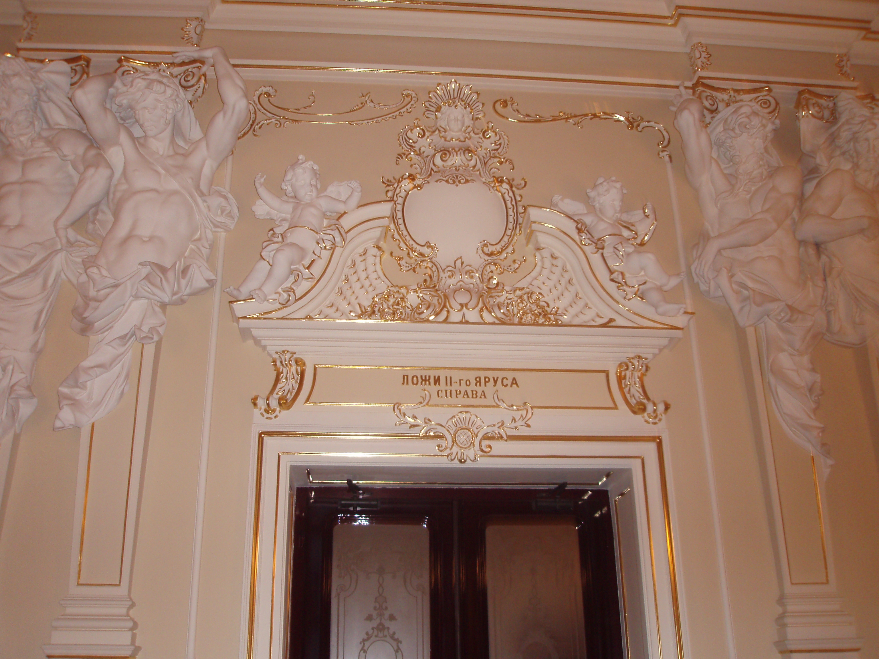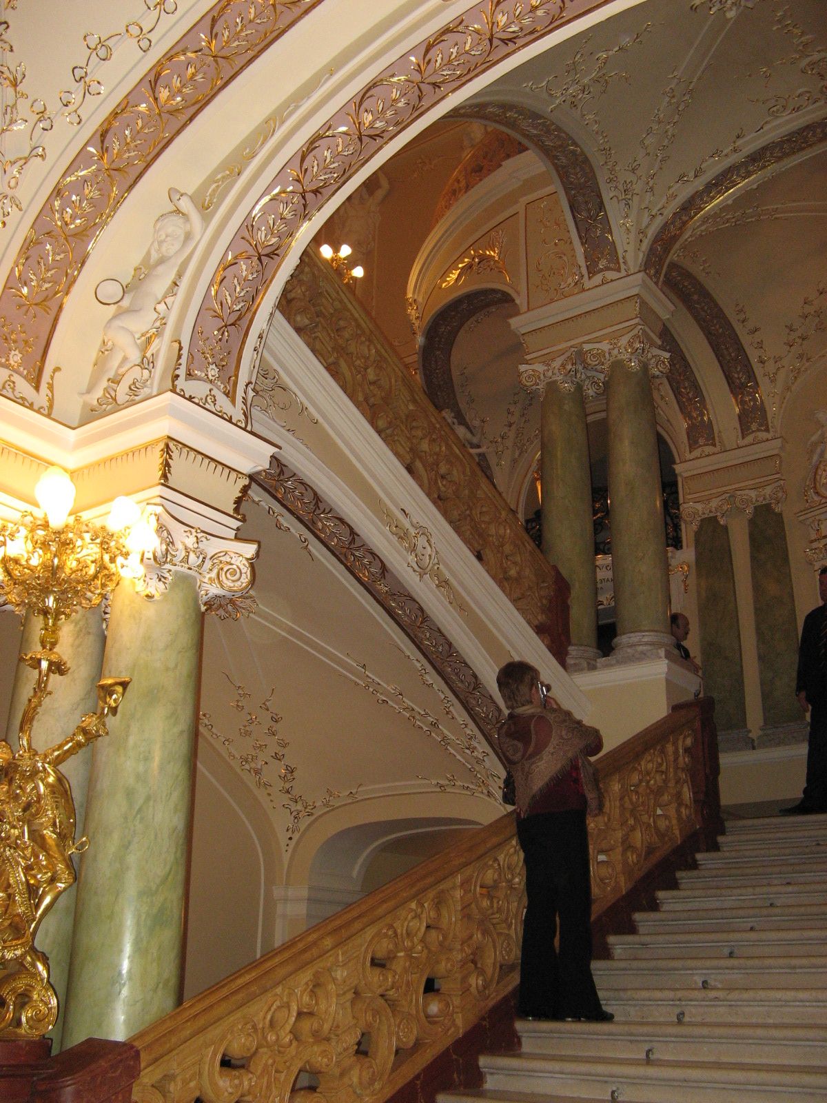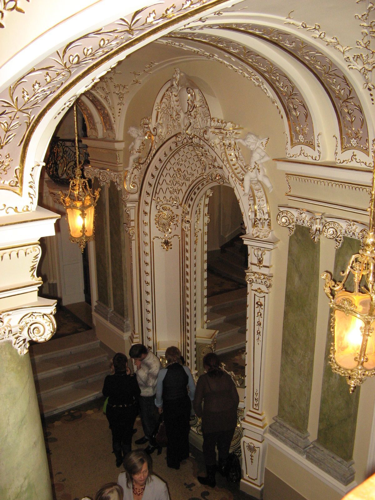 Взгляд вошедшего в зал мягко скользит от почти суровой простоты бенуара к ложам бельэтажа, в оформлении которых уже больше "роскошности", от них — к наряженным ложам первого и второго ярусов. Дальше изящная, почти воздушная аркада, опоясывающая галерею. И как финальный аккорд — хрустальная люстра.