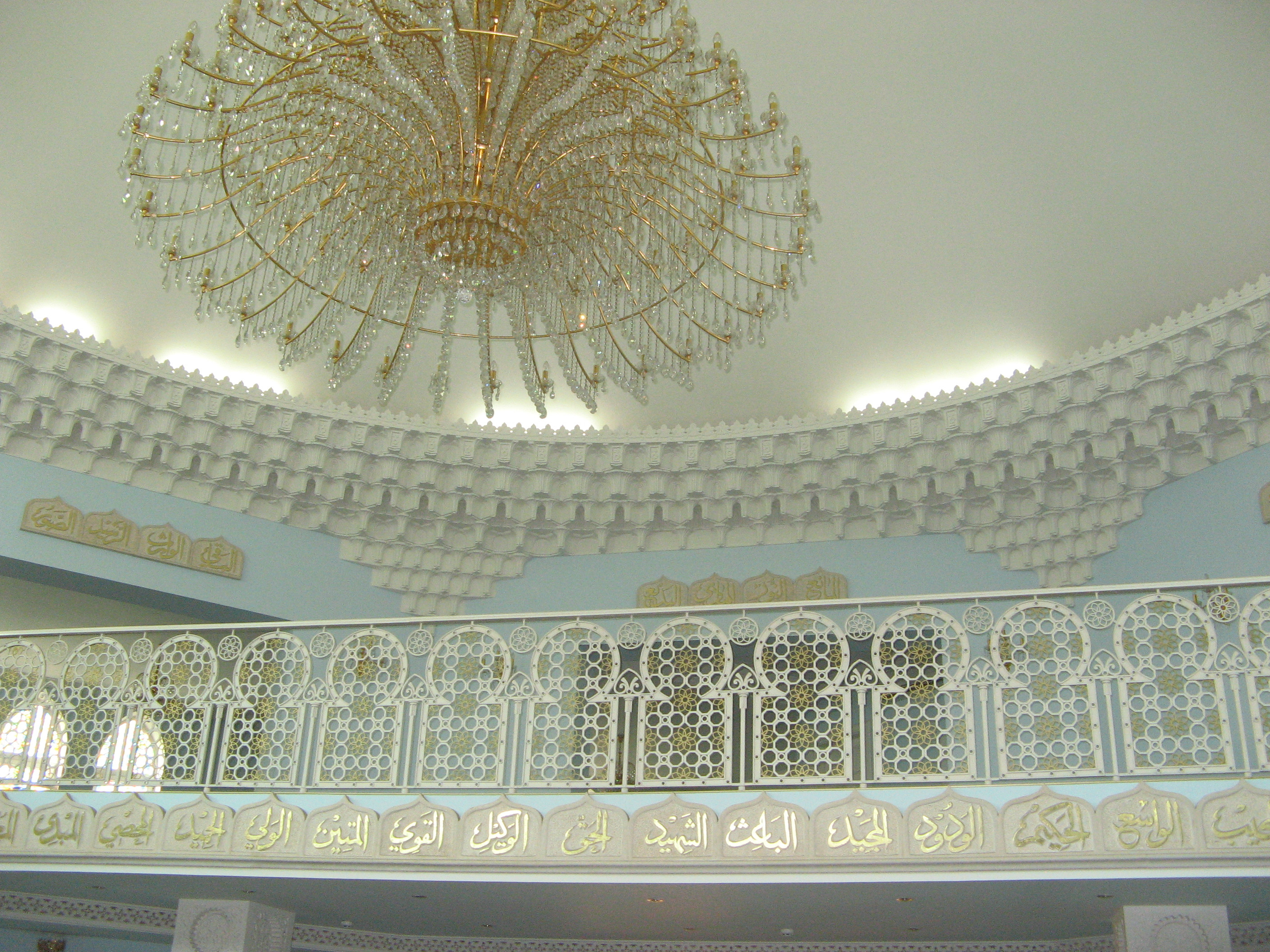 В зале для молитв очень красиво и просторно. Ажурная вязь на перилах лестниц и архитектурных элементах делают внутреннее убранство мечети изящным и воздушным. Кроме нескольких небольших полочек для книг по бокам залы, больше никакой мебели нет. Весь пол застлан мягким ковром, рисунок которого как бы делит ковер на равные квадраты. Как нам объяснил служащий мечети, эти квадраты служат условным разграничением сидячих мест для молящихся. Впереди залы — алтарь с арабской вязью. А под потолком главное украшение — большая хрустальная люстра, сияющая сотнями огоньков.