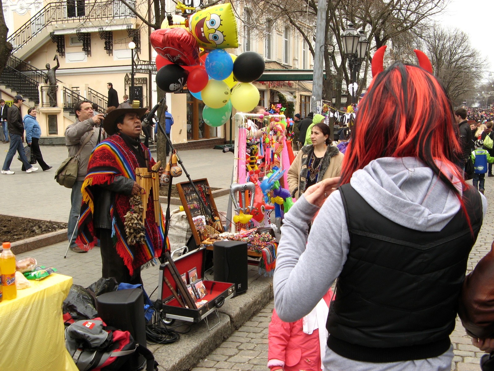 Параллельно на Дерибасовской слышались голоса конкурса караоке, индийского флейтиста, говорящего попугая, смешивающиеся с веселым гулом толпы, всяческих свистелок и пищалок.