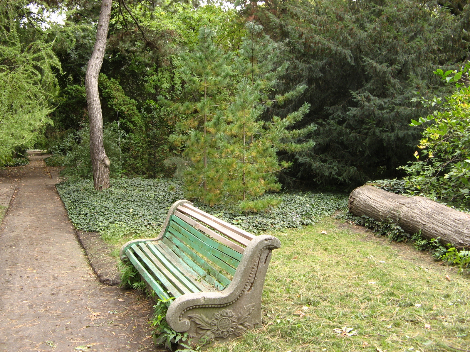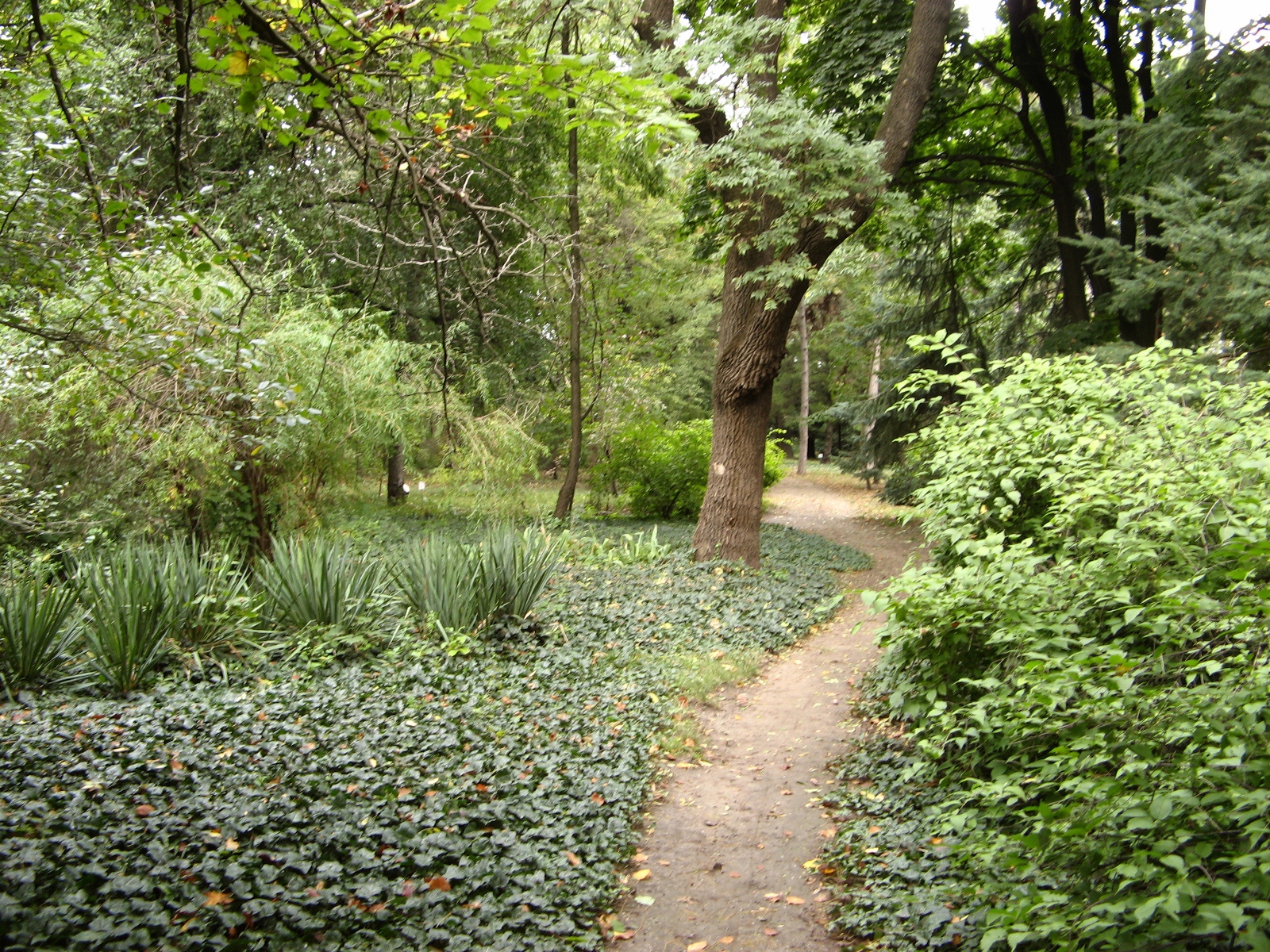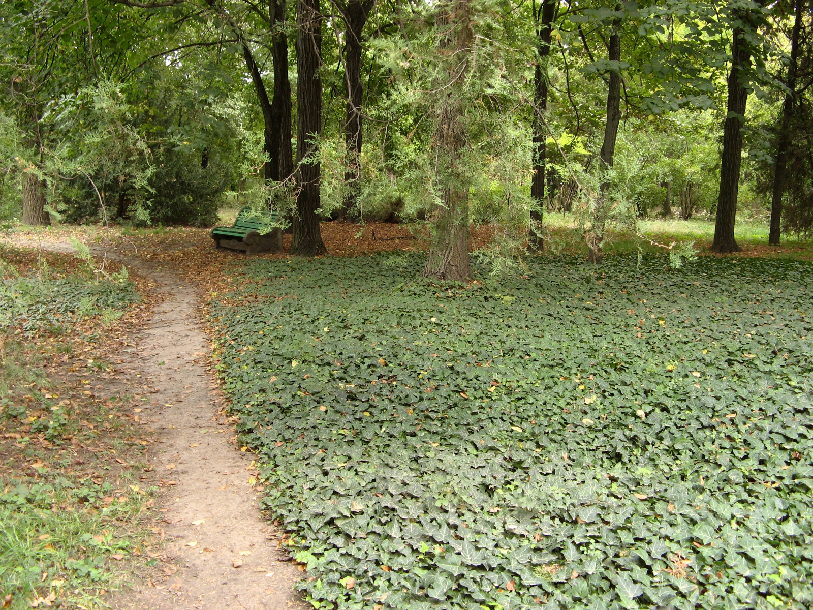 Еще одна из особенностей сада — вьющийся по земле плющ, который вместо травы густо покрывает землю у подножия деревьев. Смотрится очень красиво и необычно, ведь в основном привыкли видеть под деревьями подстриженную траву. Экскурсовод говорит, что плющ разносится птицами, работники только подстригают его у обочины тропинок.