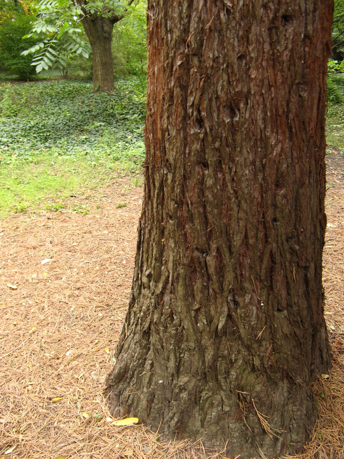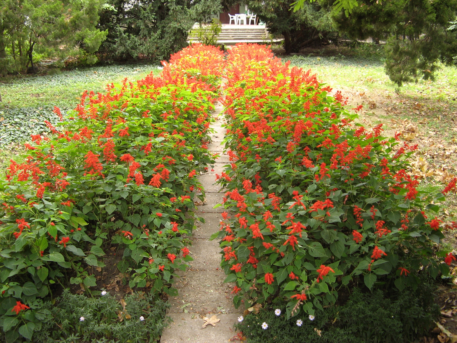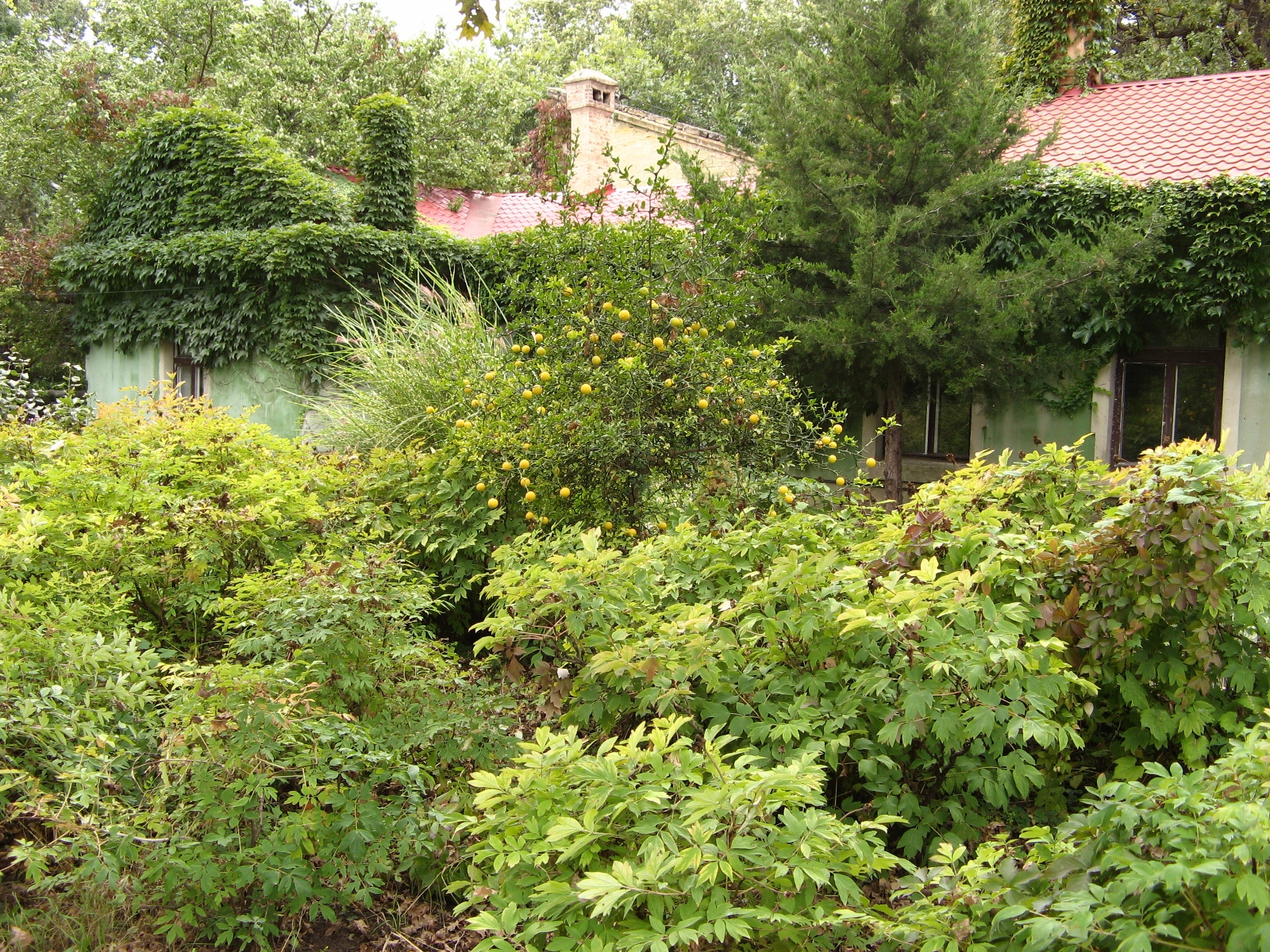 Еще одна из особенностей сада — вьющийся по земле плющ, который вместо травы густо покрывает землю у подножия деревьев. Смотрится очень красиво и необычно, ведь в основном привыкли видеть под деревьями подстриженную траву. Экскурсовод говорит, что плющ разносится птицами, работники только подстригают его у обочины тропинок.