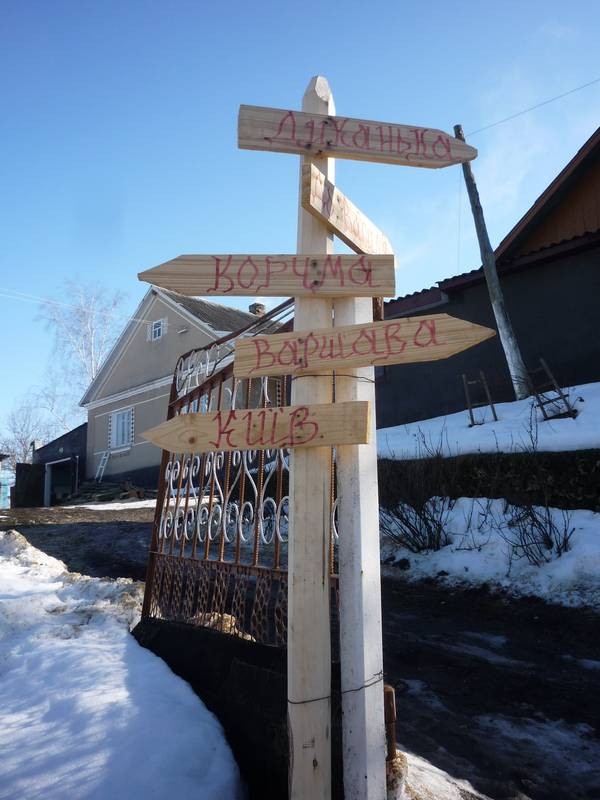 Немного далее, у дороги стоит странного вида указатель. Стрелки указывают направление – Диканька, До Василя, Корчма, Варшава, Киев. Причем, судя по всему, направление на пункт питания пользуется особой популярностью. Есть еще в селе Очеретное еще одна достопримечательность – старая водяная мельница. Правда, от колеса уже ничего не осталось, но сам объект, похоже, в рабочем состоянии. Вот только работает уже на электричестве.