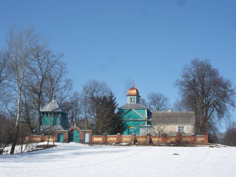 никает совершенно неожиданно. С горы открывается прекрасный вид. А на противоположном берегу небольшого озера стоит каменный храм. Он была построена на месте старой Михайловской церкви XVIII столетия, от которой осталась одна лишь колокольня.Деревянное двухъярусное строение не блещет особой изысканностью. Нижний ярус рубленый, верхний – каркасный. Высокая шатровая четырехскатная крыша, увенчана деревянной же главкой. Подобная конструкция характерна для волынской школы деревянной народной архитектуры.