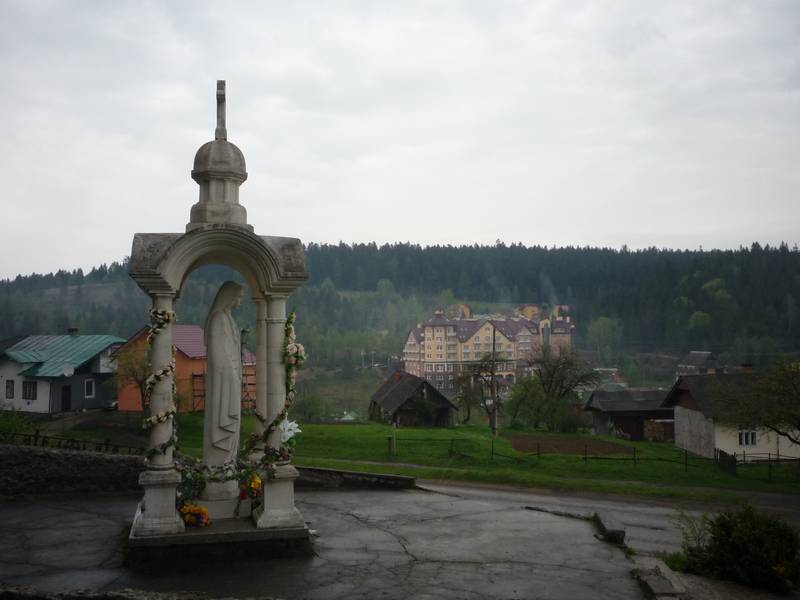 Курорт Сходница, возле которого находится известный и популярный у туристов Национальный природный парк «Сколевские Бескиды» видимо от них же и пытаются уберечь. Похоже, что эту горную дорогу принципиально не ремонтируют. Ну, а о каких либо указателях и говорить не приходится. Только стоящая у дороги святая печально провожает отчаянных путешественников — и бог с вами…