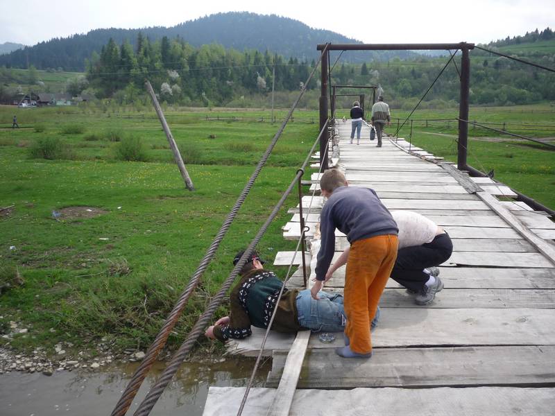 А вот встреченный рейсовый автобус вызывает, по меньшей мере, удивление. Старый, проверенный временем ПАЗик. Только он и может регулярно пробираться по этим с позволения сказать дорогам. В селе Ясеница через реку переброшен традиционный карпатский подвесной на тросах мост.
