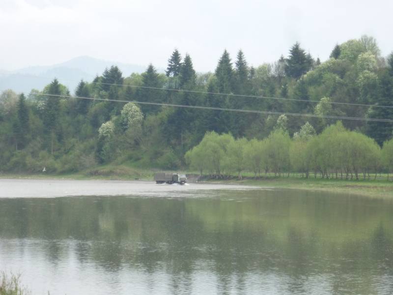 Лежа на его досках местные пацанята ловят рыбу. Вдруг с реки доносится натужное рычание дизеля. Оказывается это не лодка. Прямо по воде, причем вдоль течения едет или плывет грузовой КАМАЗ. Это же как надо не доверять своим дорогам чтобы вот так пытаться попасть с одного пункта в другой!
