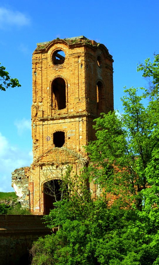А вот резиденция магнатов Вишневецких нас не впечатлила. Приехали мы в Вишневец под вечер, когда музей во дворце был уже закрыт, так что, возможно, просто упустили что-то интересное. Дворец (XV-XVIII вв.), хоть большой и со следами реставрации, выглядит сейчас неважно. Даже напрашивающаяся чугунная ограда не сохранилась. Меня заинтересовал только барельеф над порталом, на котором оригинально совмещены символы христианства, мусульманства и иудаизма. Искать дворец следует так: на большом перекрёстке возле моста через речку – поворот по указателю на Залезцы, на «треугольном круговом движении» – направо и сразу же налево, к воротам. А вот на противоположном, пологом берегу речки Горынь виднеются весьма замечательные развалины. Могу только предположить, что это была церковь-усыпальница князей Вишневецких (1530 г.).