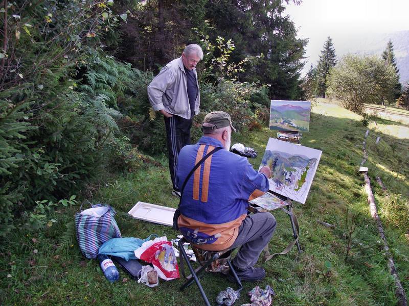 И что за интуитивная потребность мужиков собираться по трое? Вот и здесь на горе Орест Манюк со Львова скооперировался с Александрами, – Жанталаем с Донецка и Чередниченко с Сум. «Западенец» между двумя «схидняками». И ничего! Очень даже теплая компания получилась. Вот и поговори после этого о разности регионов. Ведь нашли же точки соприкосновения!Удивительно, но и здесь на самой верхотуре разбиты чьи-то огороды и стоит одинокая избушка. Пока одинокая. Потому что Славско упорно растекается по горам. Внизу в долине места уже давно нет. Вот эти альпийско-деревенские пейзажи очень заинтересовали сумчанина. Остальные подошли к выбору сюжета глобально. Если уж рисовать так целые горные цепи.