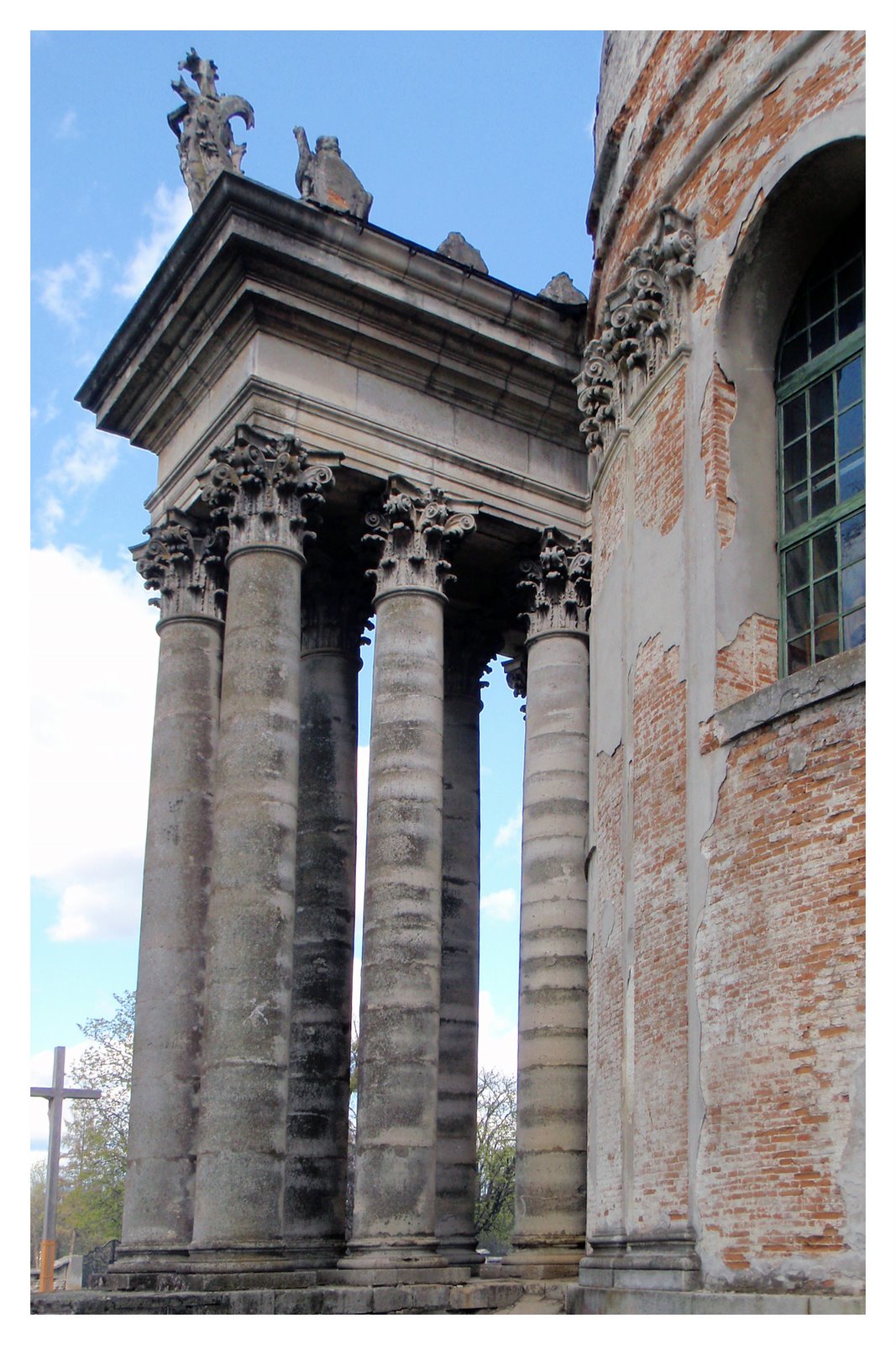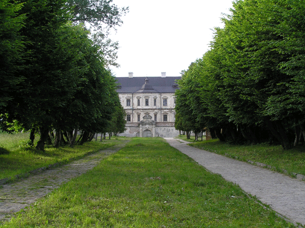 И вот мы приехали. Возле входа в замок стоял Доминиканский костел. Чувствовалось, что его строили на века, но века изменились и теперь доминиканцев, возможно, в округе не осталось. Как оказалось, Подгорецкий замок — это не замок, а скорее дворец. Его строили уже во времена, когда красота может еще и не еще победила силу, но уже нанесла ей большой урон. Сила отметилась рвом вокруг дворца с одной стороны и обрывом с остальных. Но уже обрыв был явно из арсенала красоты, так он придавал очарование виду из больших и красивых окон дворца. Дворец был также окружен парком, аллея вела из дворца к костелу.