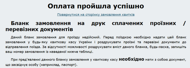 Тут как видим, еще не конец. Бланк, который Вы получите после оплаты билета, нужно будет распечатать и прийти с ним на любую из ЖД касс, где нужно будет напечатать уже настоящие билеты, которые вы предъявите кондуктору. Печать этих билетов бесплатна и ее можно осуществить непосредственно перед посадкой на поезд, конечно, сделав это заранее. Например, на центральном вокзале Киева есть окошка, возле которых никогда нет очередей, там тоже можно распечатать себе билеты.