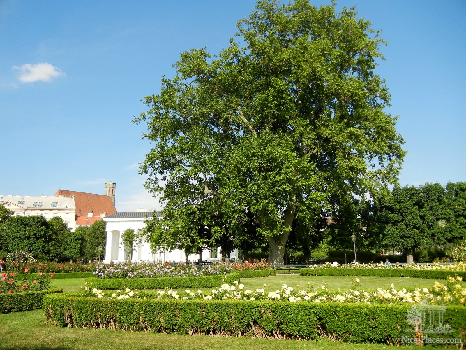 Громадный платан контрастирует с розами и подстриженными кустами