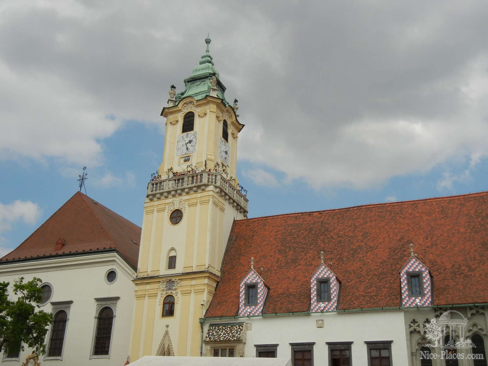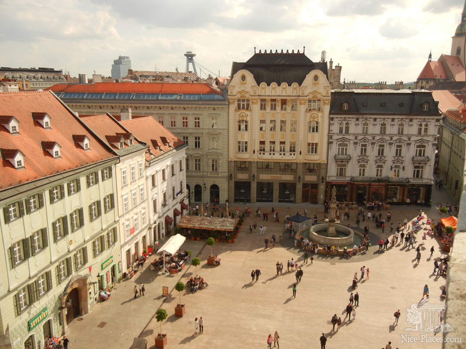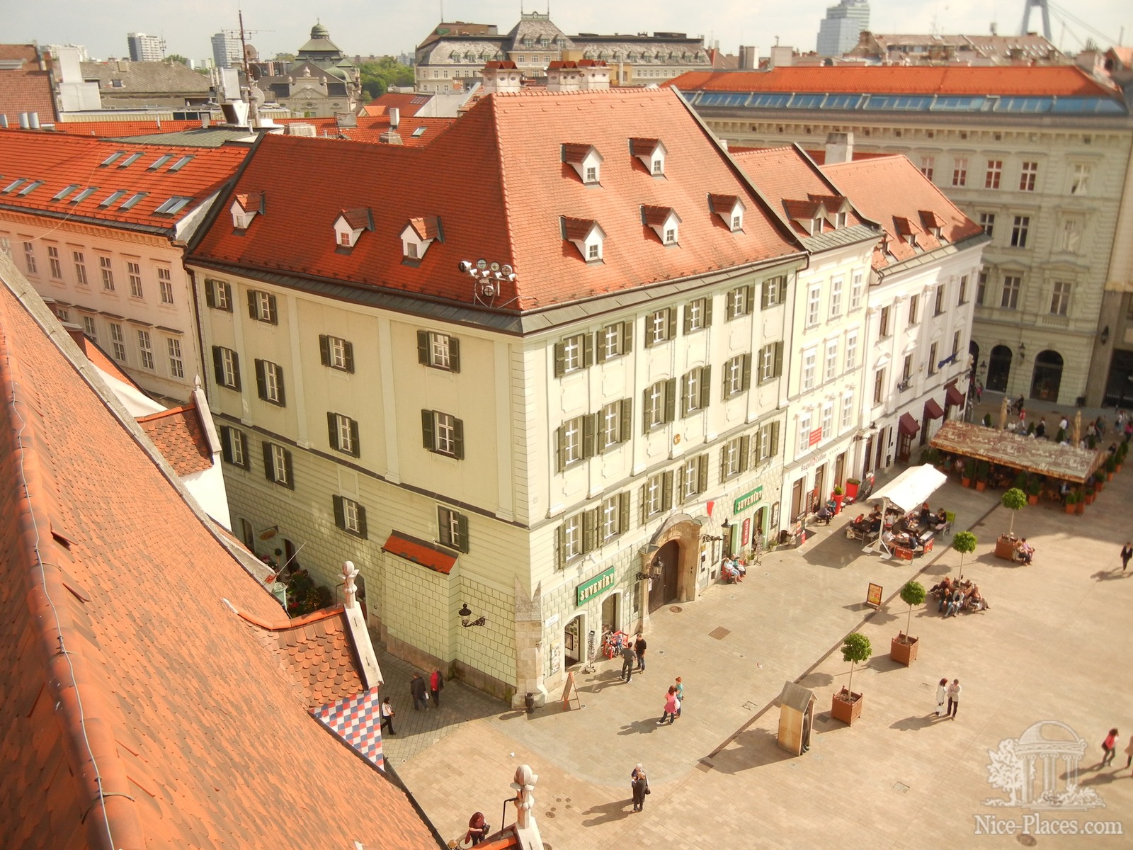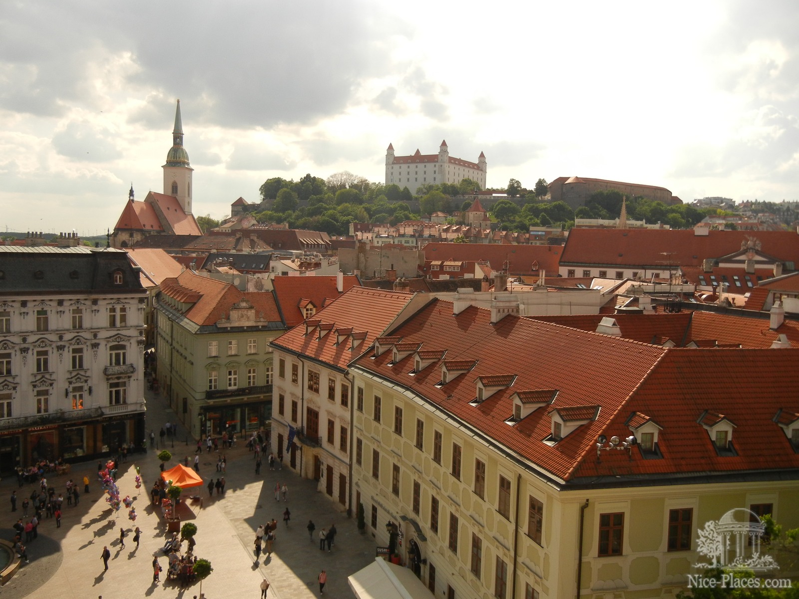 За крышами виднеется розовый Примациальный дворец, где располагается мэрия Братиславы